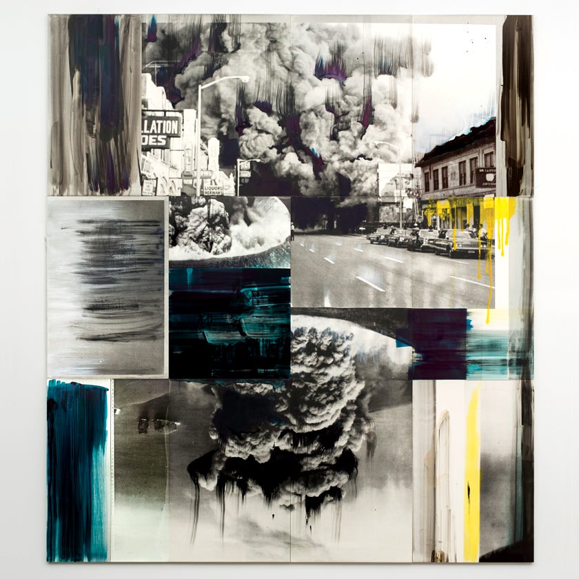 Although there are elements of collage—images from Ebony magazine mixed with old black-and-white photos from Arctic expeditions—these are primarily largescale ink paintings. Simpson, who painted in college, returned to the medium in 2015. Despite their jewel-toned beauty, the paintings depict a place where one would not want to live. Terrains appear uninviting and unstable. Not surprisingly, when discussing the series, Simpson notes that daily life in America is becoming a “heightened, inhospitable condition.” In this new work, she has traded the stark messaging of images like “Waterbearer” for something more abstract but no less bold.