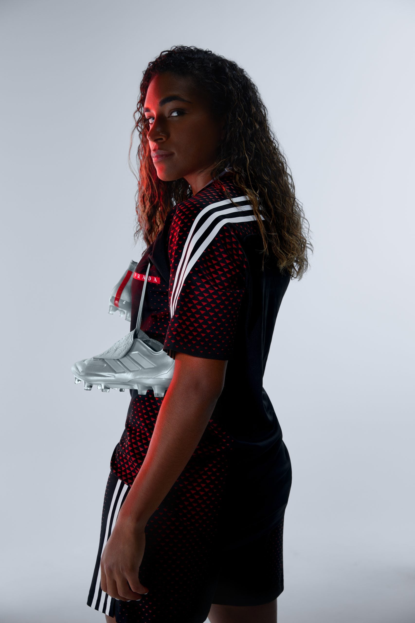 The adidas Football for Prada collection features three classic adidas products with Prada detailing that every soccer player loves — the Predator Accuracy, the Copa Pure, and the X Crazyfast “Prada is just classy,” states Macario. “The fact that they were able to transform athletic shoes like this is adidas but also it’s Prada, it’s something that is very special, and I feel incredibly honored to be a part of this campaign. As soon as they showed me the cleats, I was like, ‘Oh, do we get to wear these? They’re too sexy for sure.”