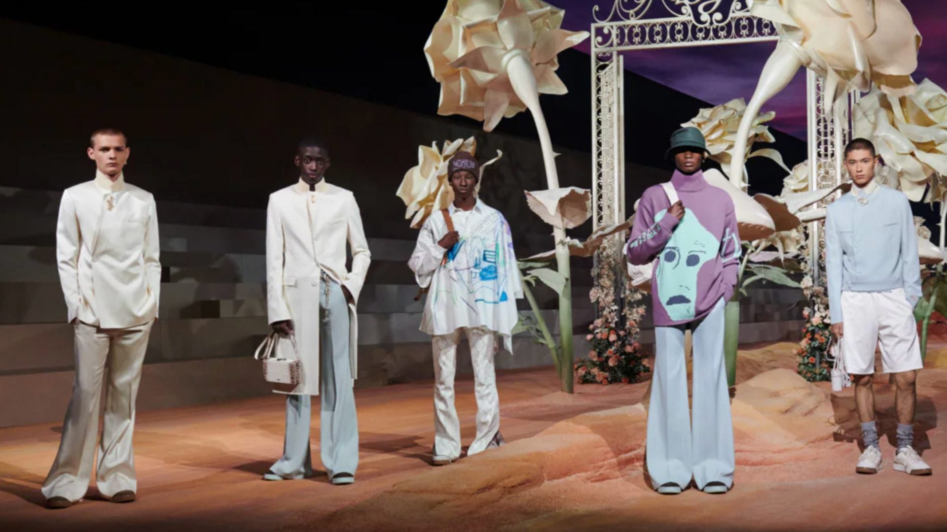The full collection consists of tops, jackets and pants astutely tailored for a precise fit along with a string of clever graphics and spotless colored looks tying together sportswear with couture. Dior Mens artistic director Kim Jones also collaborated with Dior Joaillerie artistic director Victoire de Castellane on a jewelry piece — a cactus necklace, blooming with precious gems — made especially for the show. Shoes were also a huge part of the collection with three various designs of black, beige and brown. With tops washed to resemble tour merch and accessories derived from ’60s archives, the collection delivers an original take on the traditional garb.