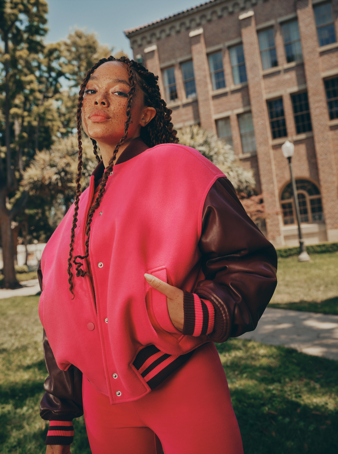 Studiousness and style intersect in this collection. The campaign features other great pieces like gray and navy blue shackets and corsets, pink and maroon collegiate-inspired bomber jackets, and faux leather trousers in hot pink and black. This collection is made to keep you cozy while still looking chic for class in the fall.