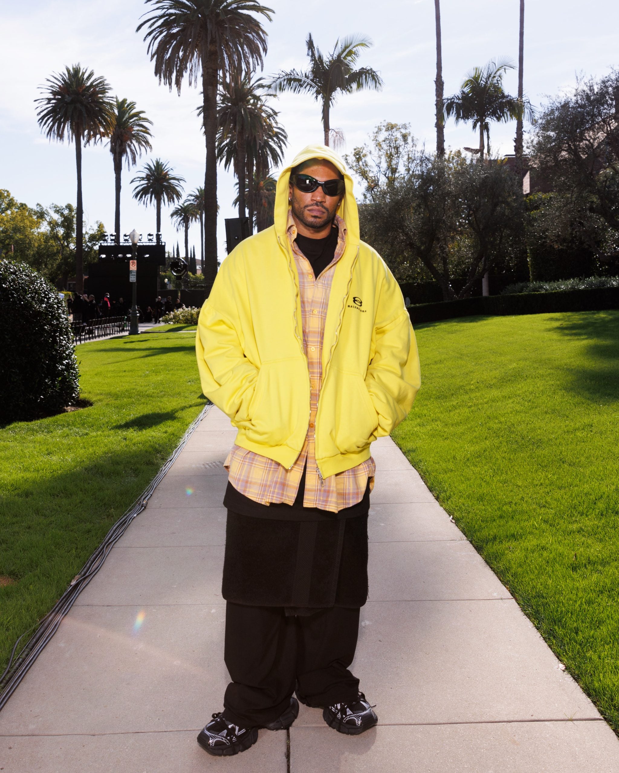 Last year, Kaytranada attended the GQ Man of the Year Party in a sleek, two-piece ensemble from Ferragamo’s Fall/Winter 2023 collection. The look was comprised of a succinct grey hooded jacket and trouser set. He also mentions Rick Owens, noting that while it’s not his style per se, he appreciates it from afar, reflecting his expanding taste.