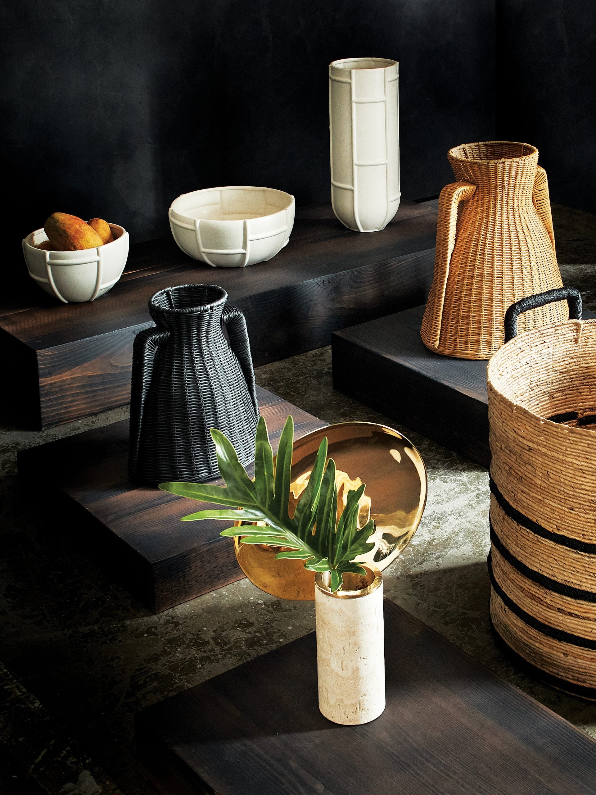 Luana Woven Vase Basket:The black decorative vase, hand-woven of rattan, is inspired by the ancient craft of basketry and its connection between earth and hand. (Designed by Élan Byrd, based in Miami, Florida)