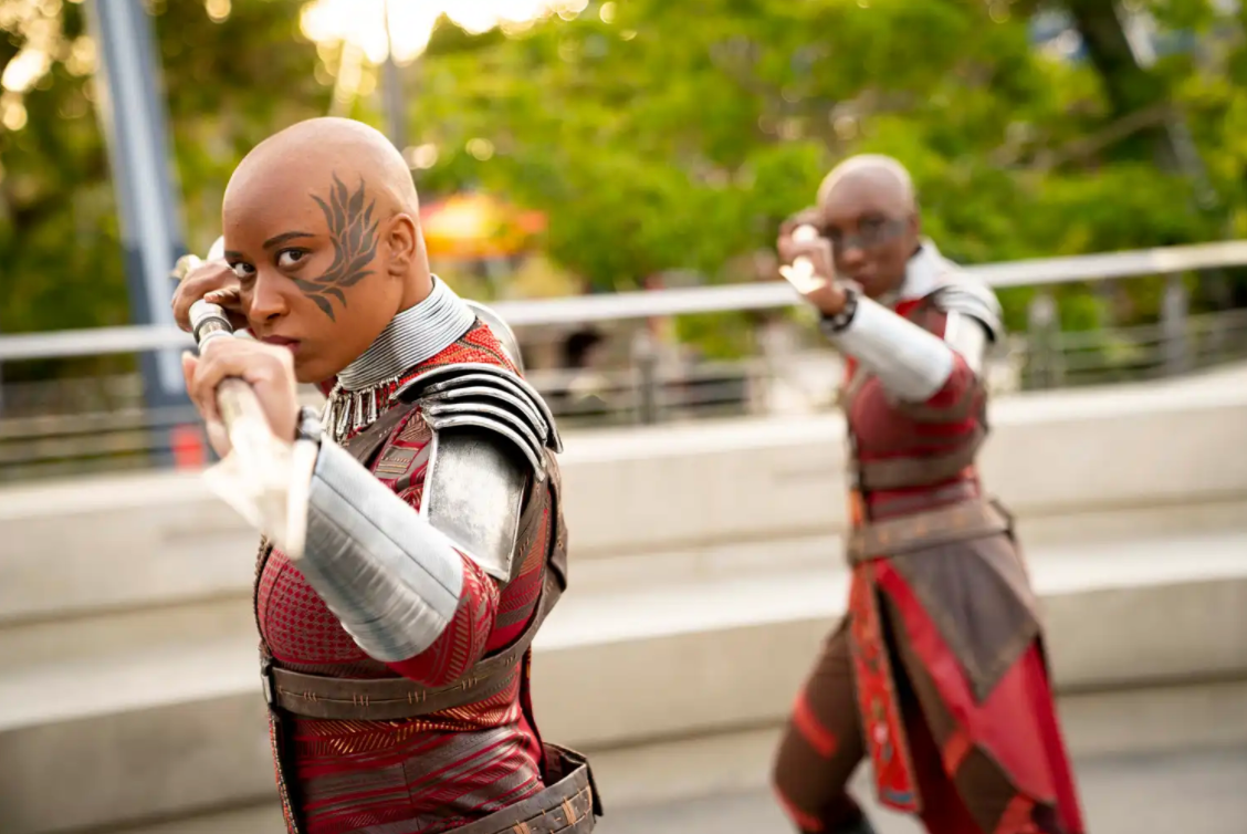 Now for the magic. My very grown-up heart sputtered a bit when Black Panther’s Dora Milaje made a grand entrance onto the new campus. Beautiful, Black and powerful women commanding the campus with a battle simulation equipped with spears and choreographed moves. At that moment, it dawned on me that I had never experienced Black women celebrated so boldly at a theme park. My mind started dancing with visions of the young girls in my life enjoying the whole presentation of Okoye and her warriors at the landmark Disney campus. It’s remarkable to see us recognized as the heroes we are and warriors amongst the crime fighters we believe in.