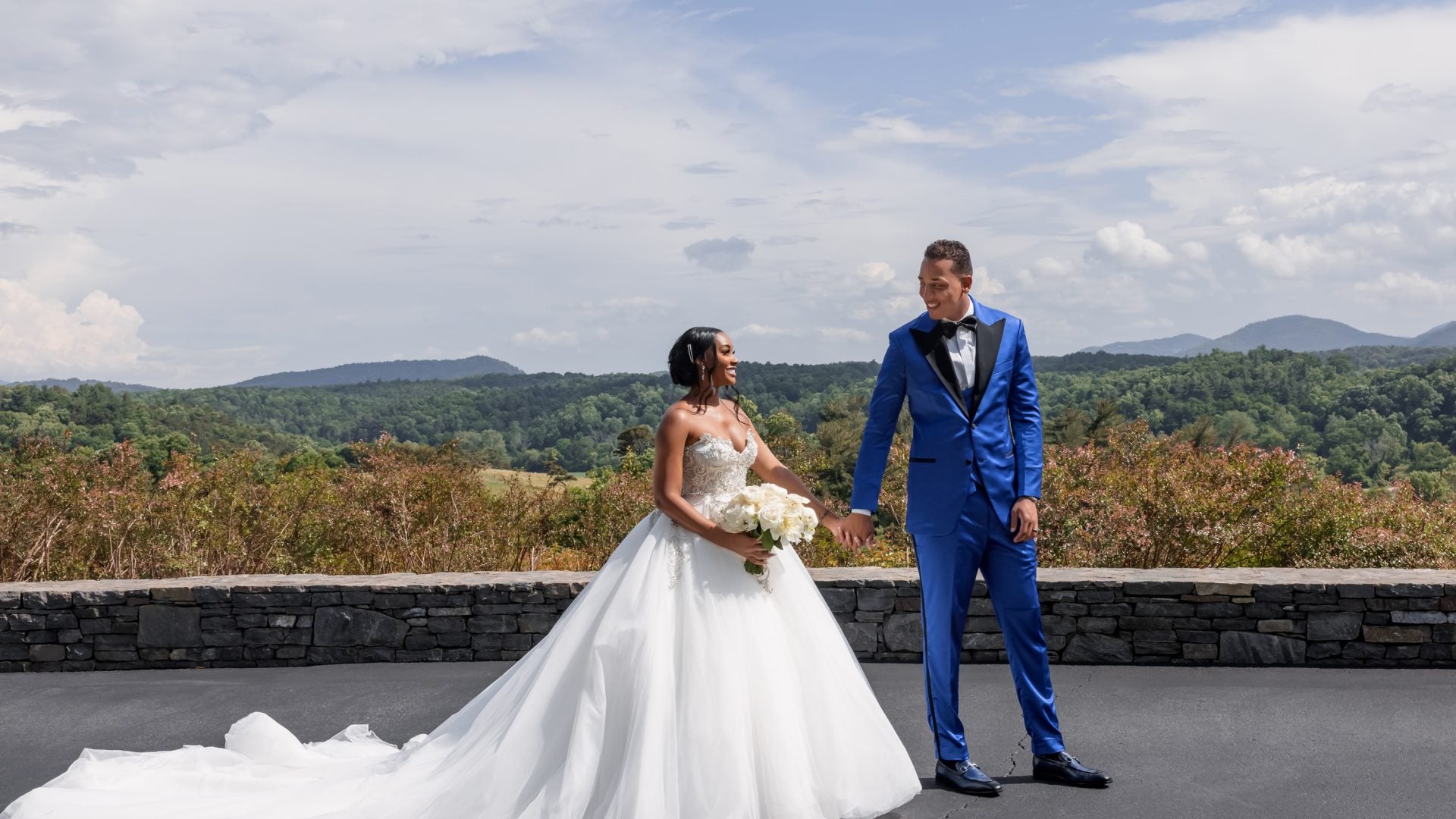 Luv, 31, and Barrett, 32, who are also the couple behind the Luv N Slim YouTube channel, were all smiles on their big day, which took place at the spectacular Biltmore Estate in Asheville, North Carolina—a stunning, grand venue fit for a fairytale wedding to be remembered. While strong thunderstorms threatened to shut their wedding day own, after months of careful planning, ultimately the skies opened up and the couple were able to see their dream wedding come alive. “The colors were cobalt blue and gold,” Luv tells ESSENCE. “I had six ladies in my bridal party and Corey had eight groomsmen. ” One hundred guests were on hand to watch the couple become husband and wife.