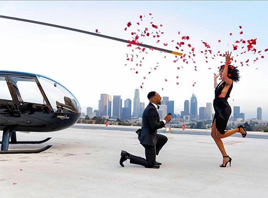 The couple shot their soon-to-be engagement photos on top of CitiBank’s helipad with a helicopter and the City of Angels as their backdrop. As Rachel prepared for a scene for their elegant shoot, she had no clue that after she twirled and tossed red roses in the air that Kornelius would be down on one knee with a ring. After their engagement, Kornelius whisked Rachel off for a wonderful night around town.
