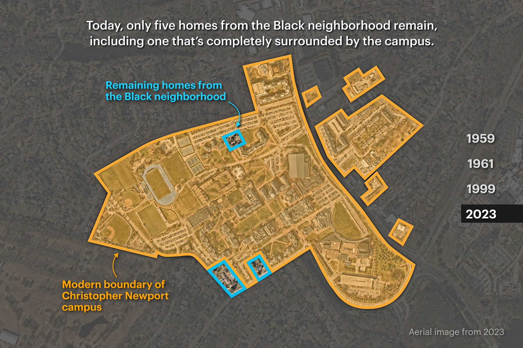 In practice, the university wasn’t so patient. In 2005, its board of visitors authorized Trible to take three properties by eminent domain for a parking lot, after negotiations reached an impasse. Black people owned two of the lots. The university sought court approval to take at least one parcel, records show. A university spokesperson said that Christopher Newport’s real estate foundation purchased the properties without resorting to eminent domain.