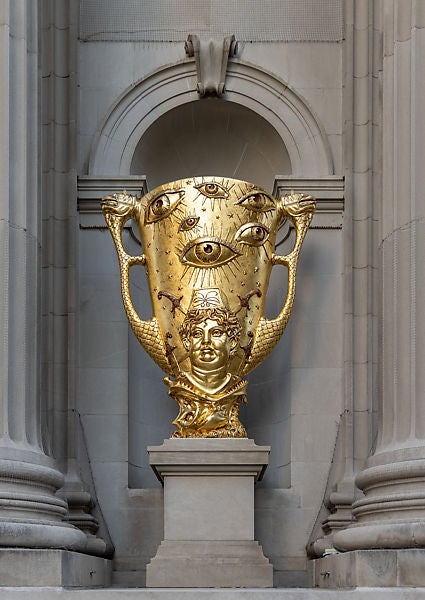 Gilt is the third in a series of commissions for The Met’s historic facade. Borrowing the format of trophies—emblems of competition and victory—Hew Locke has created four sculptures that reflect on the exercise and representation of power. Gilt will run Sept. 15 – May 22, 2023 at Metropolitan Museum of Art.