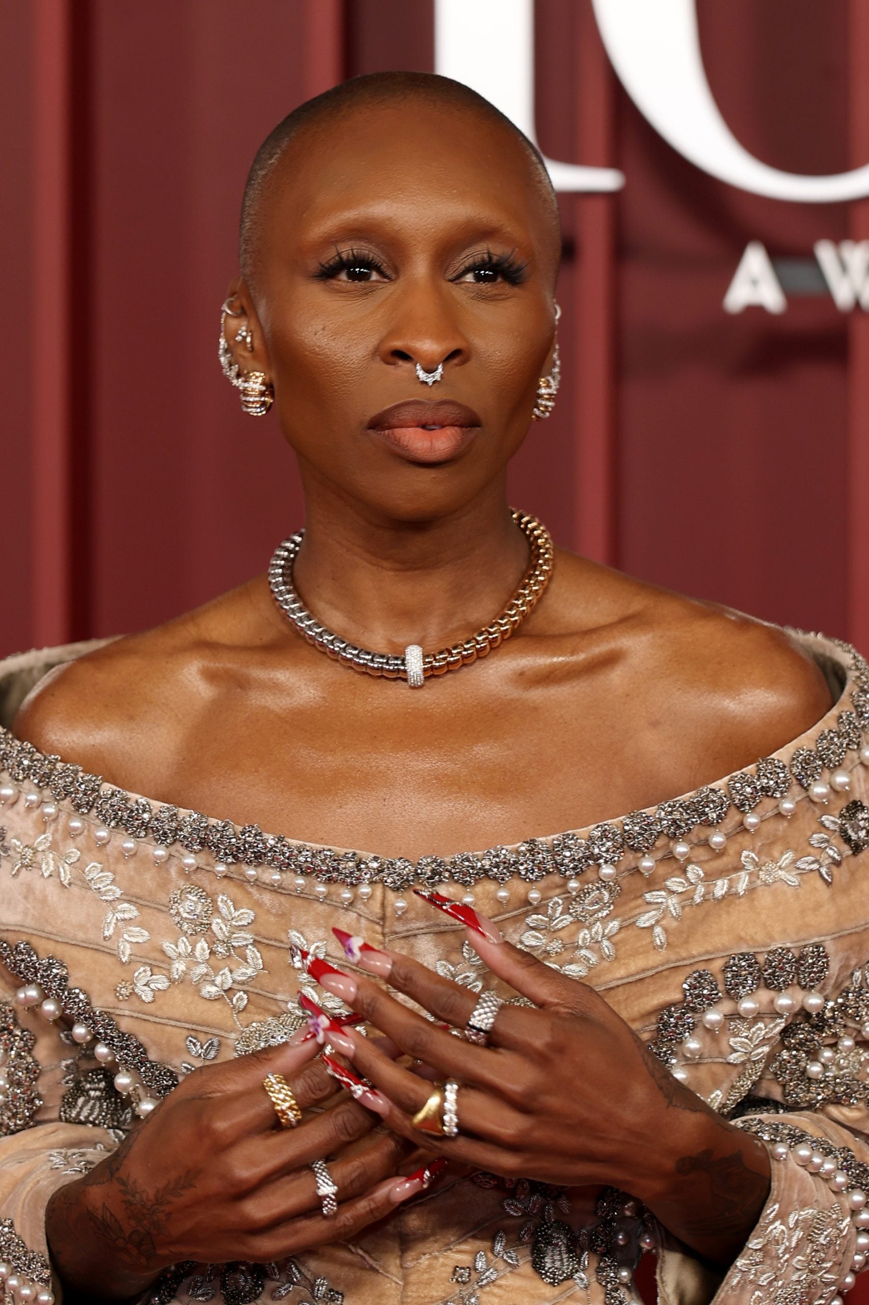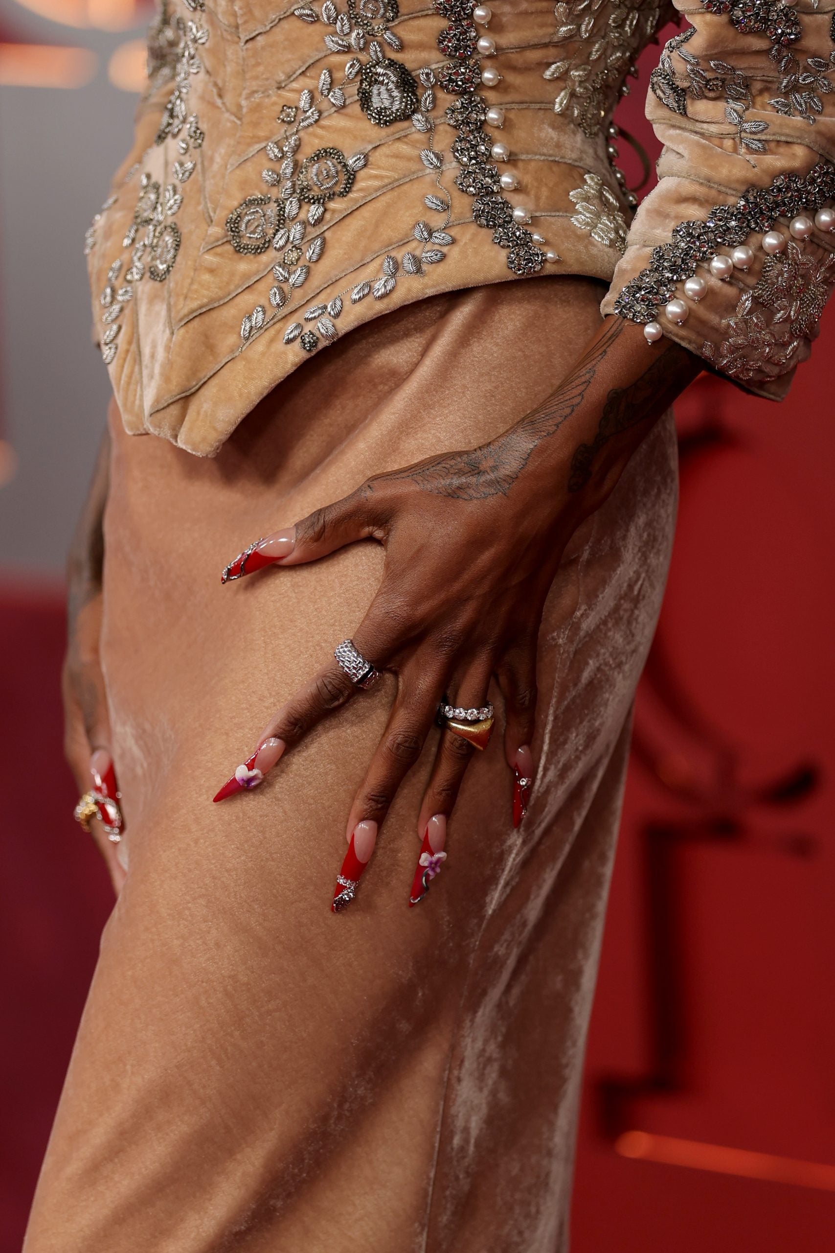 While Erivo is big on lashes, she’s still primarily known for her theatrical manicures. “This nail look is a bold, sculptural celebration of red carpet elegance, with a touch of softness and romance,” celebrity manicurist Mycah Dior says. “The design features a deep, gradient crimson tip over a natural base, embellished with hand-sculpted orchid flowers, delicate vines, and jeweled accents.”