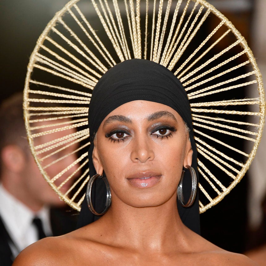 Solange stepped out in a futuristic black latex-like frock by Iris Van Herpen and paired it with a black durag and a halo headpiece.