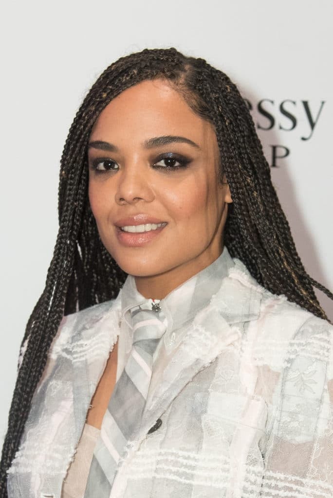 The metallic purple lip and the shaved design in her head make for the edgiest red carpet look yet.Tessa Thompson at the Sorry to Bother You Premiere