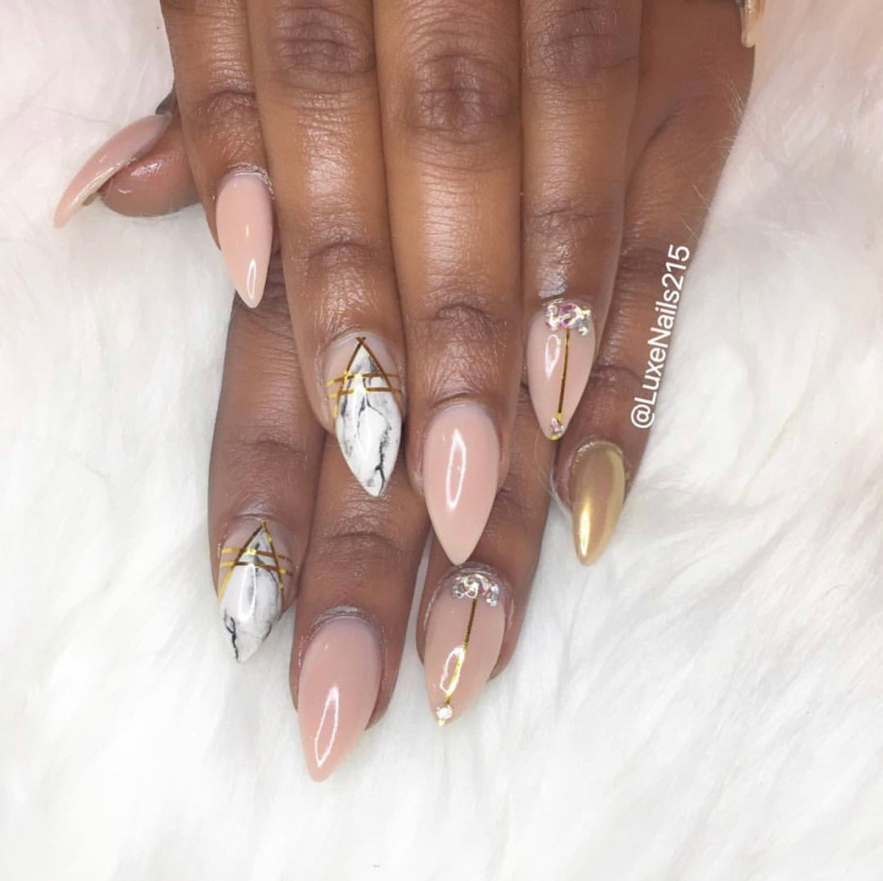 Gold trim, a splash of marble, and jewels checks all the boxes for perfect wedding day nails.