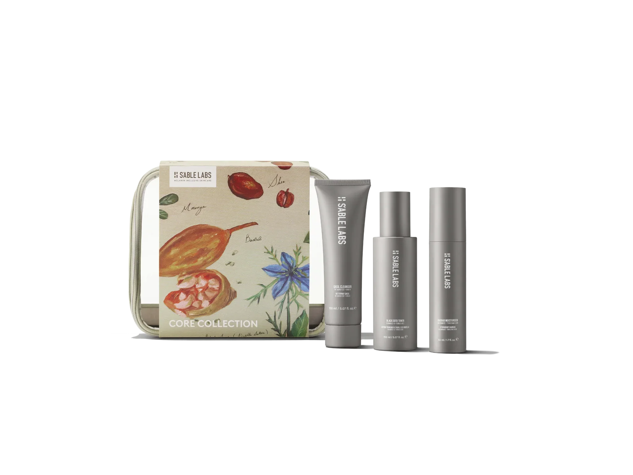 Give the gift of African beauty this season with the simple 3-step skincare routine Sabrina Elba uses—a qasil cleanser, black seed toner, and baobab moisturizer—all stored in a limited-edition bamboo travel bag. Available at sablelabs.co