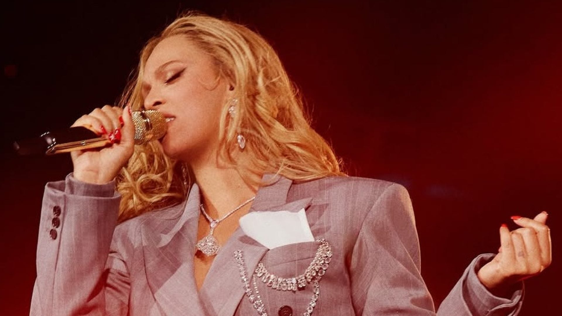 Much like her hair looks, the makeup artist Rokael Lizama played his cards with a nude lipstick (think: Rokael Beauty’s Refined Gold Velvet Lip Creme in “Shekinah”), folding in the classic Texan red lip—similar to the one her mother, Ms. Tina Knowles, is known for. Meanwhile, her eyes were a smoking gun at times, like night two in Los Angeles, and gilded gold on others. See: Chicago, night three.