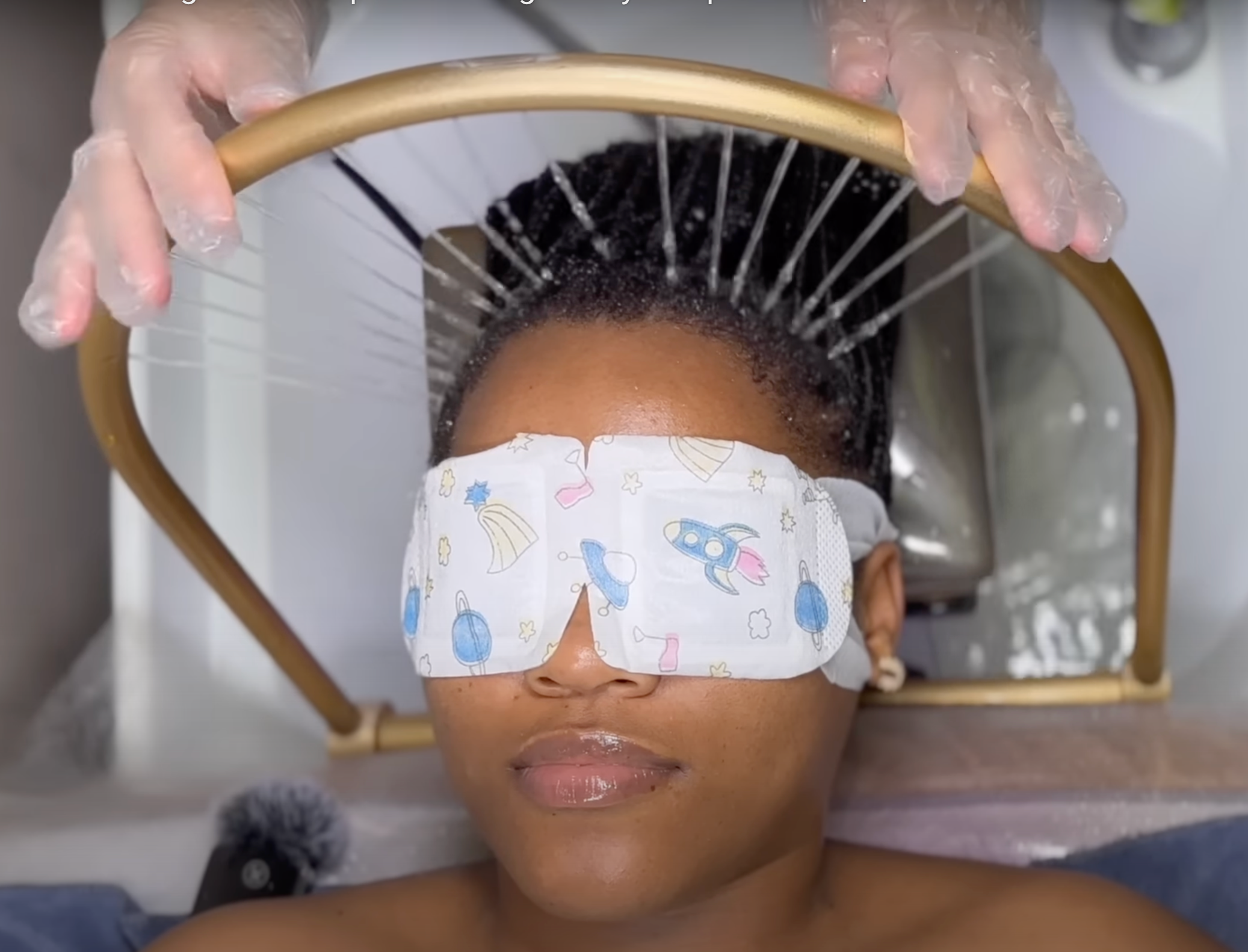 The head practitioner used a scalp wand, a tool used to increase blood circulation and reduce stress. With a heated eye mask on, Cingo received a scalp rinse with a Chinese water ring massage. “The warmth from the eye mask and the water entering my braid rows made my brain melt,” she said of the treatment in a Youtube video. The head practitioner then massaged shampoo into her scalp and braids, cleansing her hair with ginger for anti-inflammatory benefits.