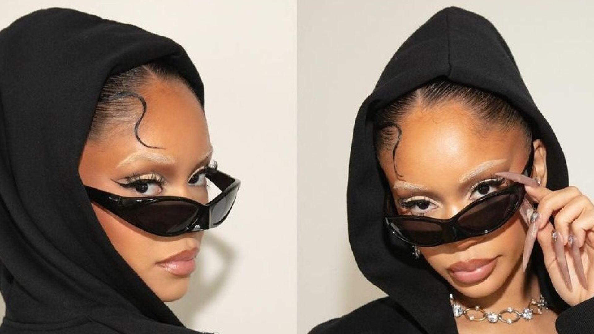 At the top of our feed, celebrities went back to blonde… eyebrows, that is. Just look at Kelela’s MFW hair with bleached brows and a straight middle part wig to match. Then there’s Saweetie, who usually sticks with her natural tone, this time dyeing her brows to match her light, neutral eyeshadow.