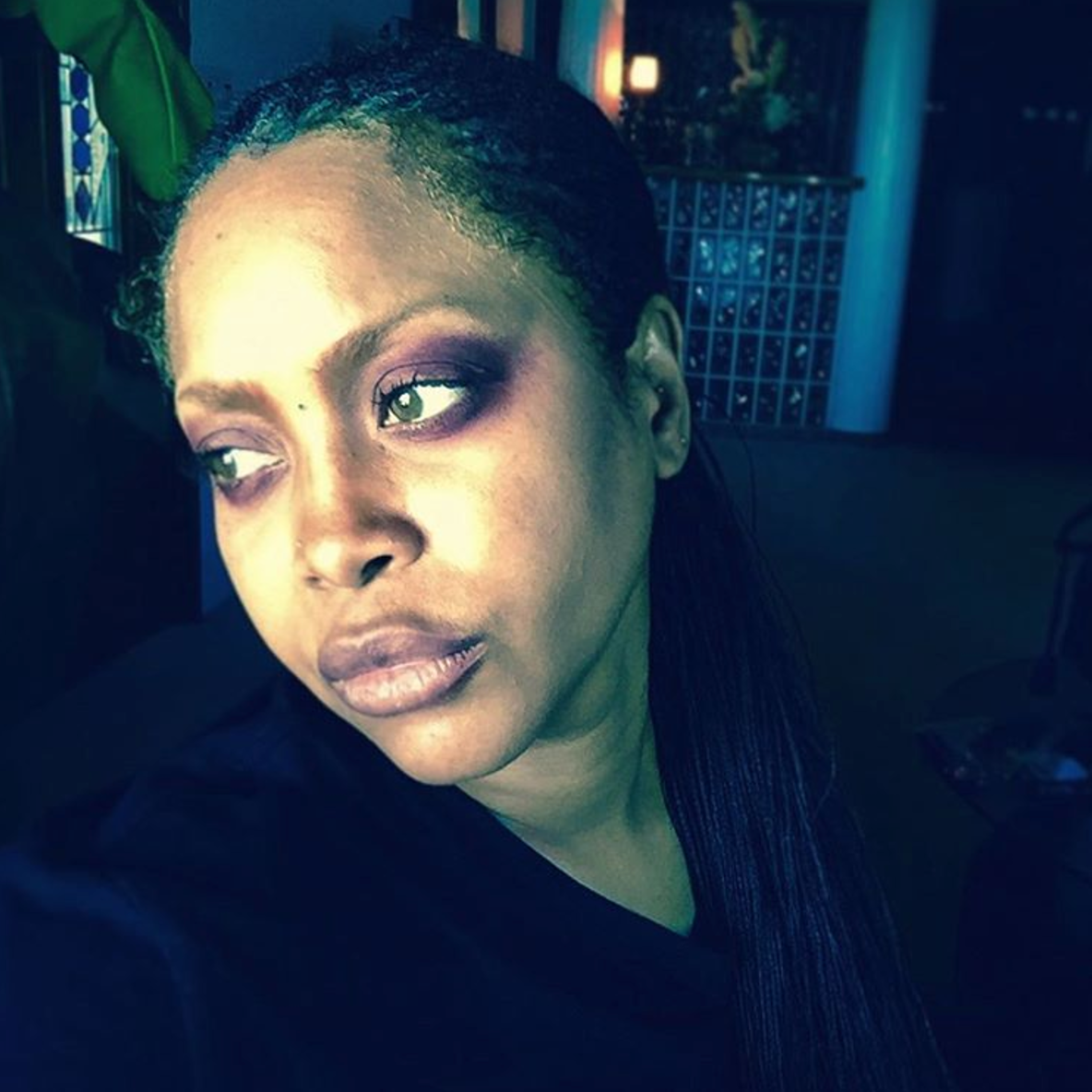 The purple eyeshadow stands out in this photo and makes Erykah’s eyes shine.