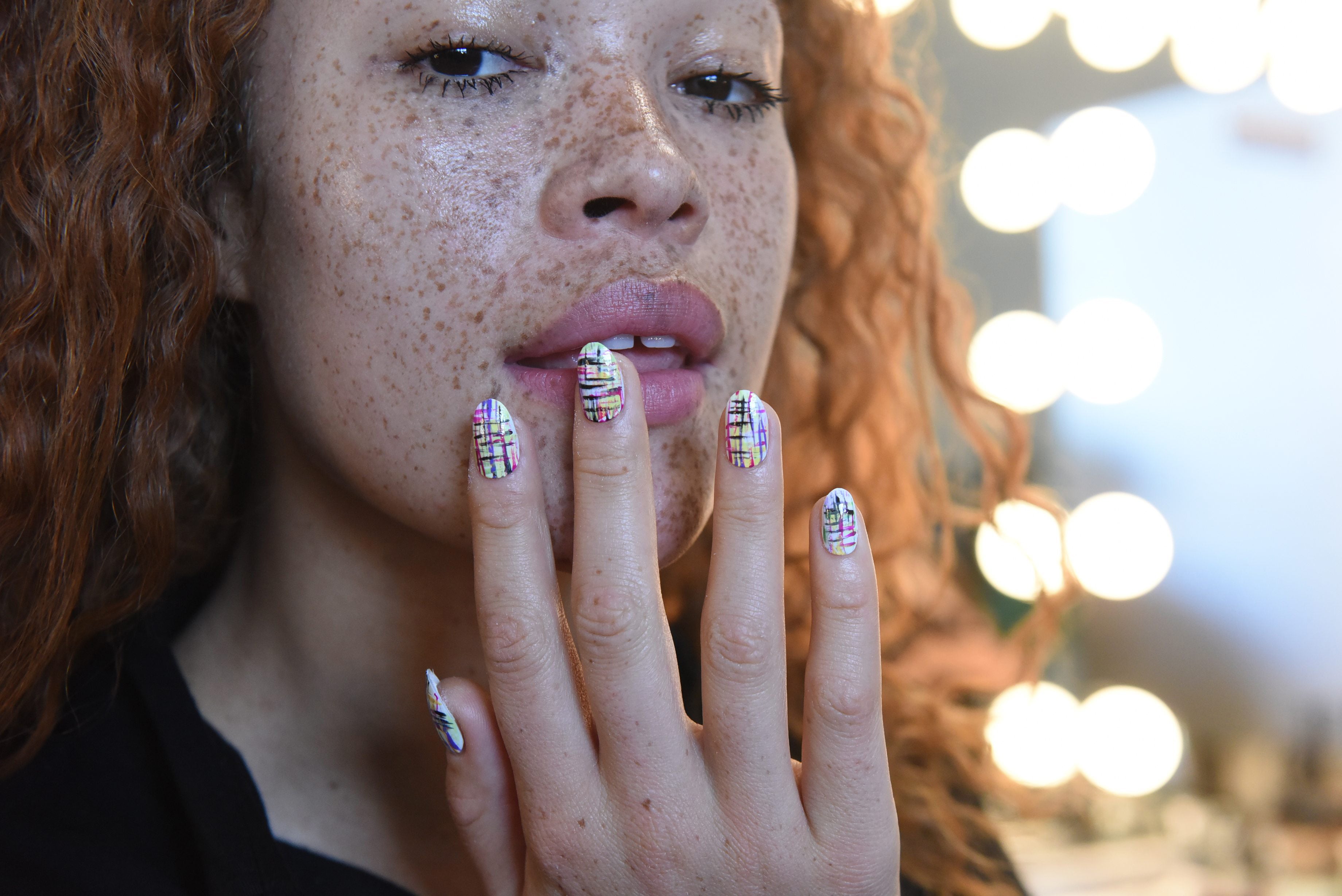 Manicurist Gina Edwards used a striping brush to paint a multicolored tweed pattern over the Kiss imPRESS Press-On Manicure in Flash Mob ($6; walmart.com), which she used as a base.