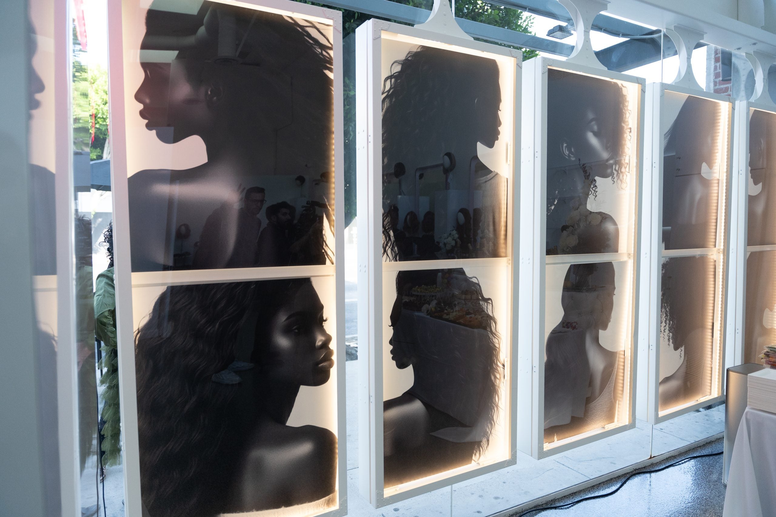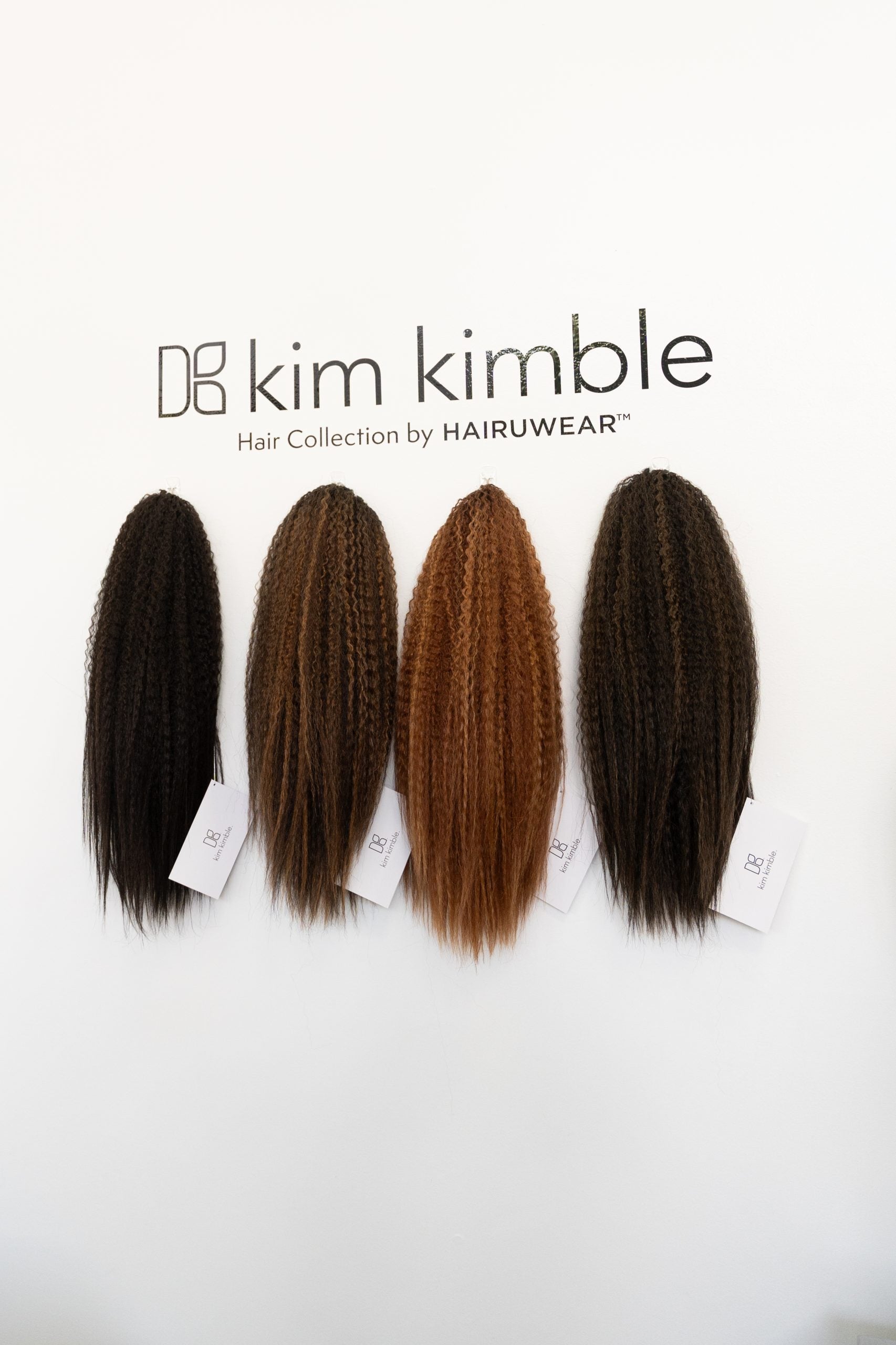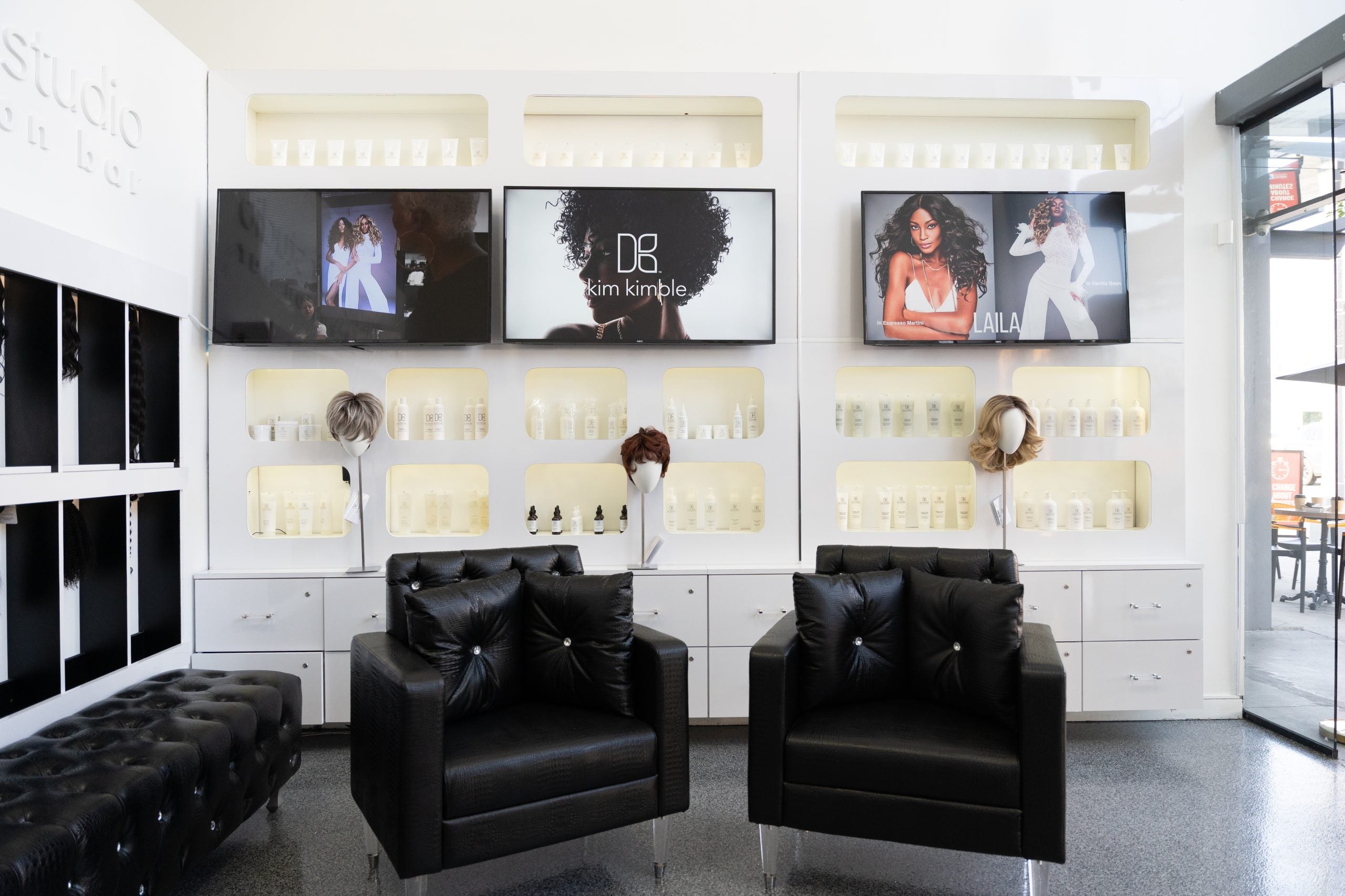 Inside the space, you’ll find Kimble’s hair products and offerings—like custom extensions and wigs for clients to touch and feel—hanging on the wall. Additionally, videos and framed movie posters of her past on-camera work—think: BAPS, her tv show LA Hair, Dreamgirls and Sparkle—are on display for a jolt of inspiration.