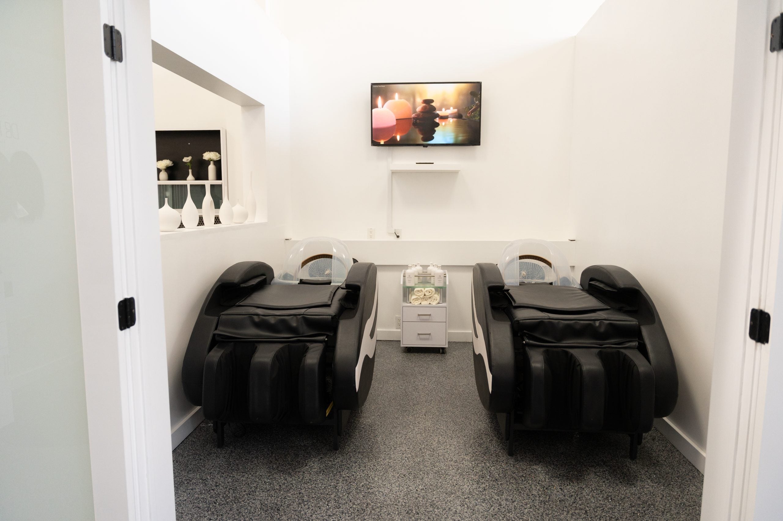That said, your relaxation journey begins upon entering the establishment, where customers are greeted by ultra-chic black and white designs—with a touch of sparkle, of course—that perfectly reflect Kimble’s personal style. “I have tried to use designers before,” she says in reference to her former salons, “and it didn’t always work out.”