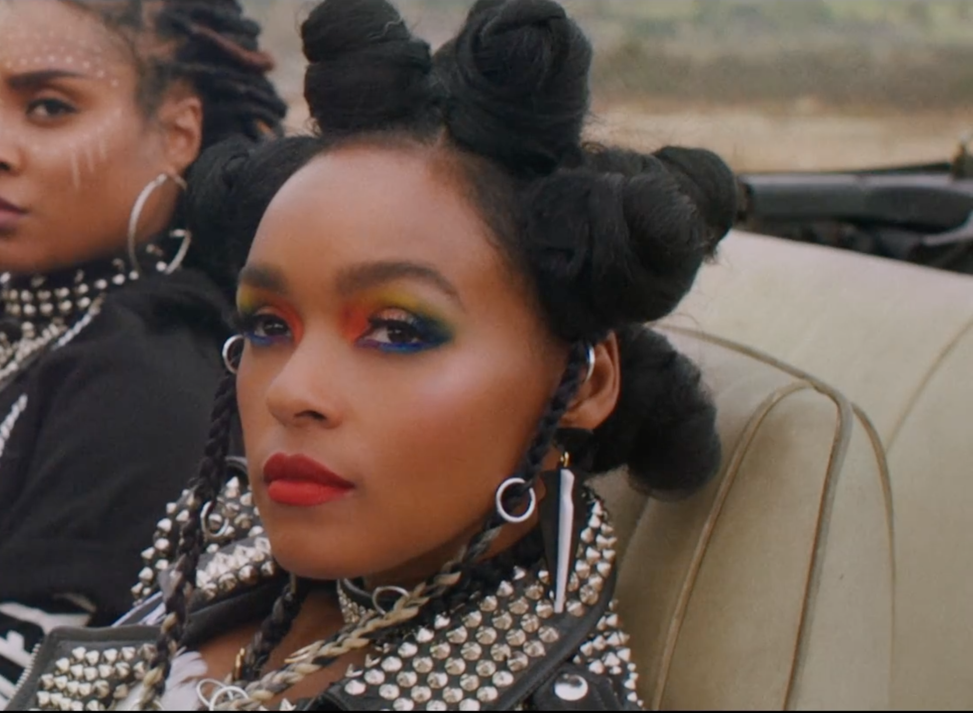 Here, Monáe sports large Bantu knots and a few small braids down the side, but it’s really her LGBTQ flag-inspired eye makeup we can’t stop staring at.