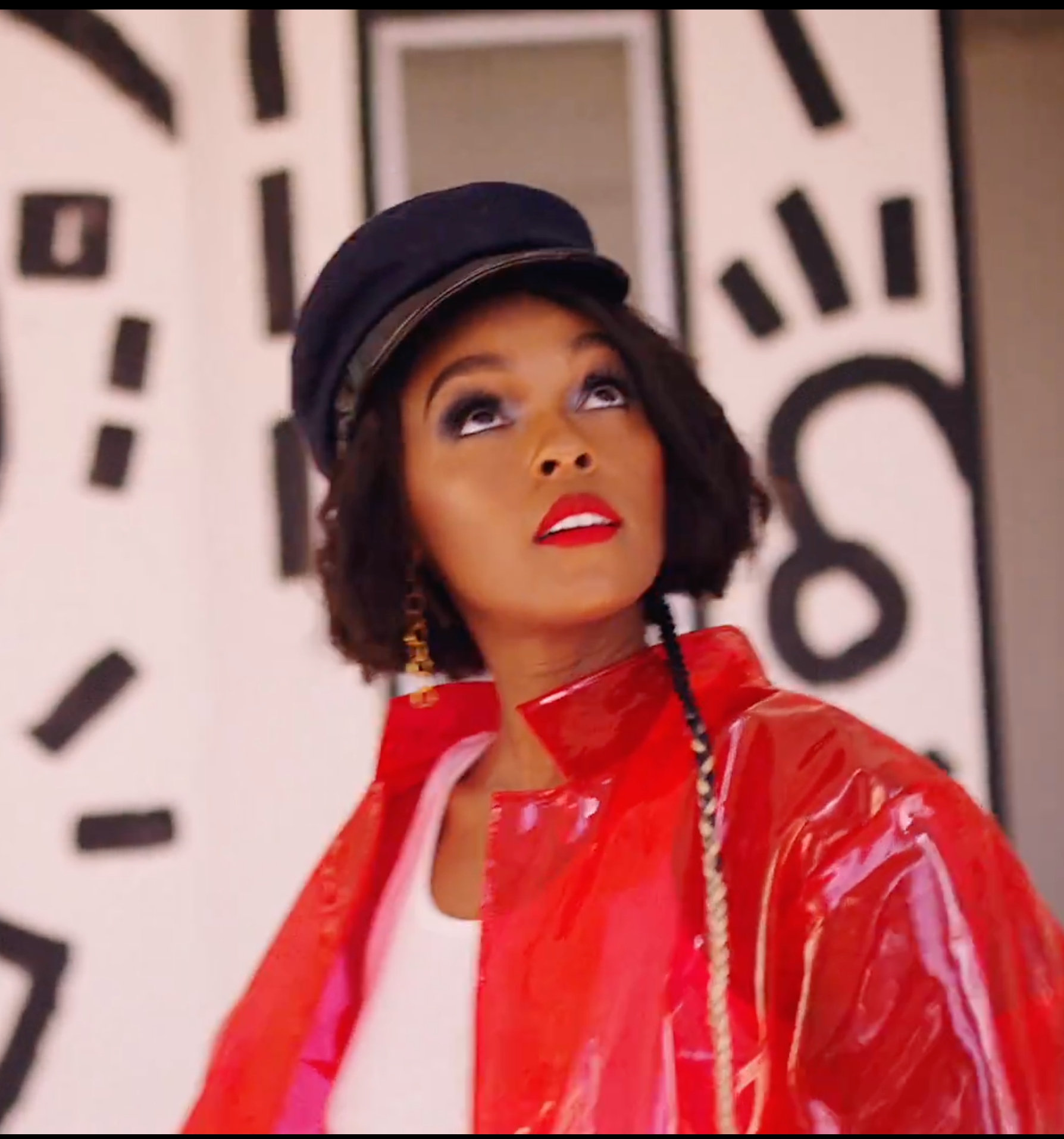 For most of the visual, Monáe’s textured hairstyles are adorned with beautiful accessories, such as pink pom-poms, flowers and kufi caps. But she also accentuated her braid with a big hoop ring.