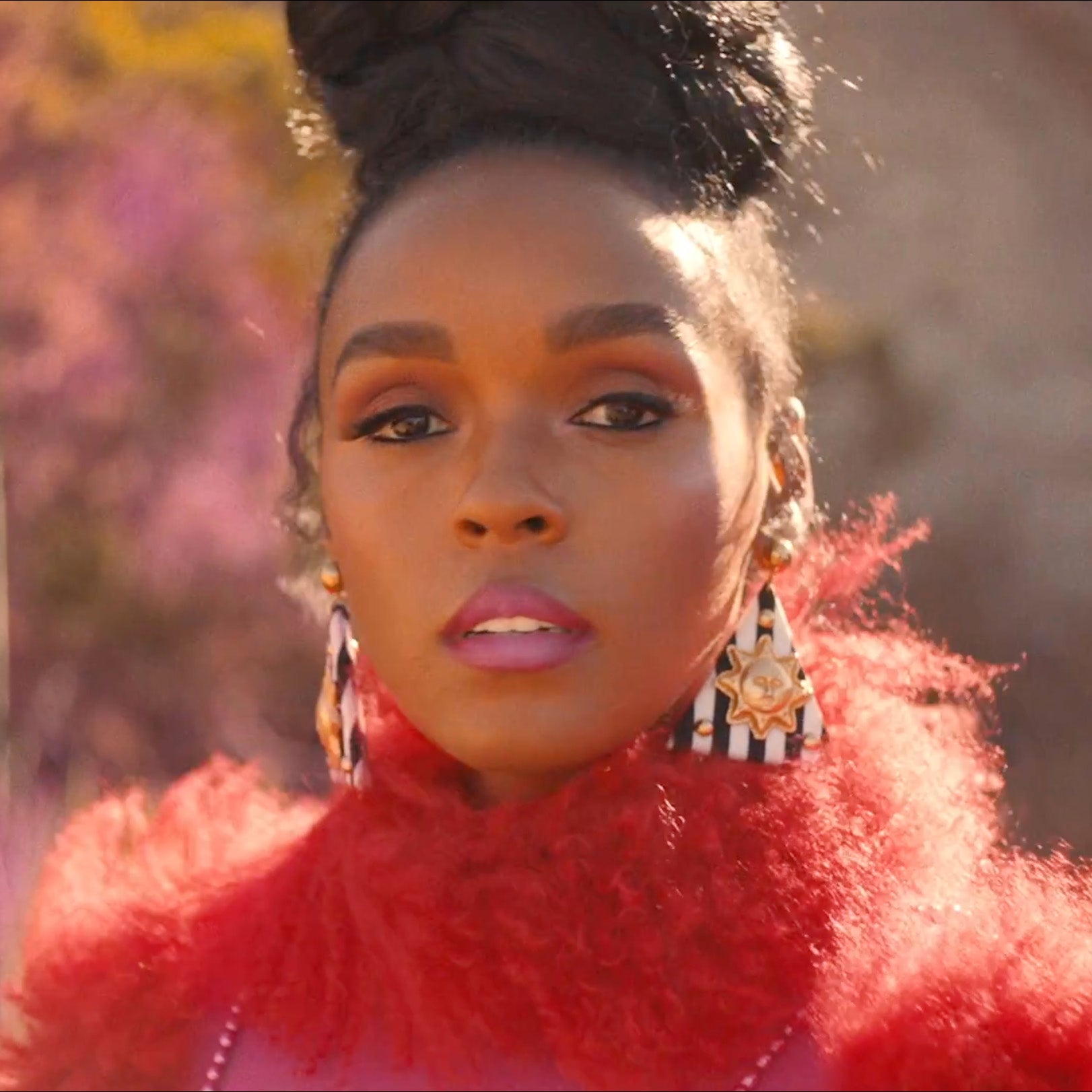 Monáe swapped out the braids and scarlet red lip color for a messy top knot and ombré pink lip, and we like that.