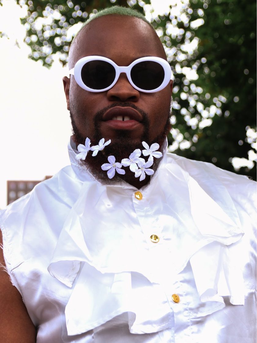 “Flowers are usually associated with being feminine but I want to break that society’s standard and I always go against the grain, so I just pop a few flowers up in here and I feel mad beautiful. My hair is a sweet mint, inspired by Mint Condition. I’m a colored boy with colored hair.”