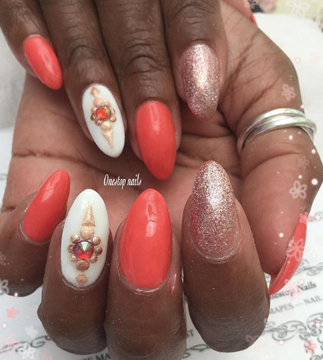 This warm orange and jeweled accent nail make for a fun and textured mani.
