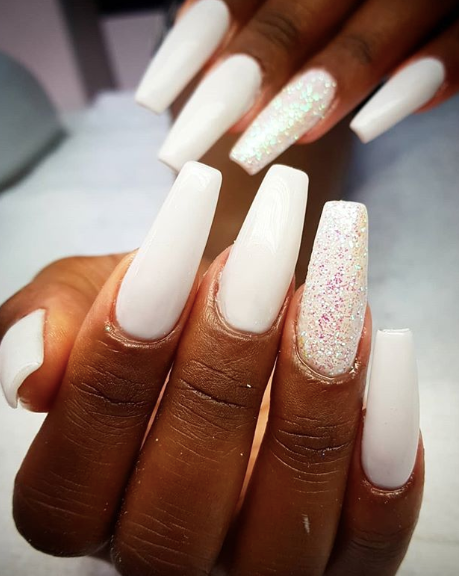 This bright white is taken to new heights with glitter accents is a magical look.