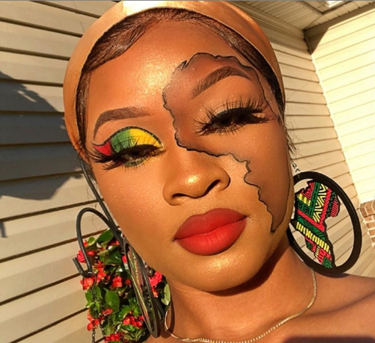 This weekend I was excited and delighted by Michigan-based makeup artist Deborah Bland (@BeatsByDeb). With just two years in the game, the 20-year-old creates countless over the top and creative color cosmetics looks that truly showcase her art. In a look that she posted late July, the beauty was inspired by a pair of $1 Africa earrings and Paris-based beauty expert Amandine (@amandineyk), who did a makeup look that had the shape of Africa outlined on her face. Deb said she then did research and found that most of the flags on the continent included either red, green, yellow, or black, so she used those colors as a jumping off point for the look.