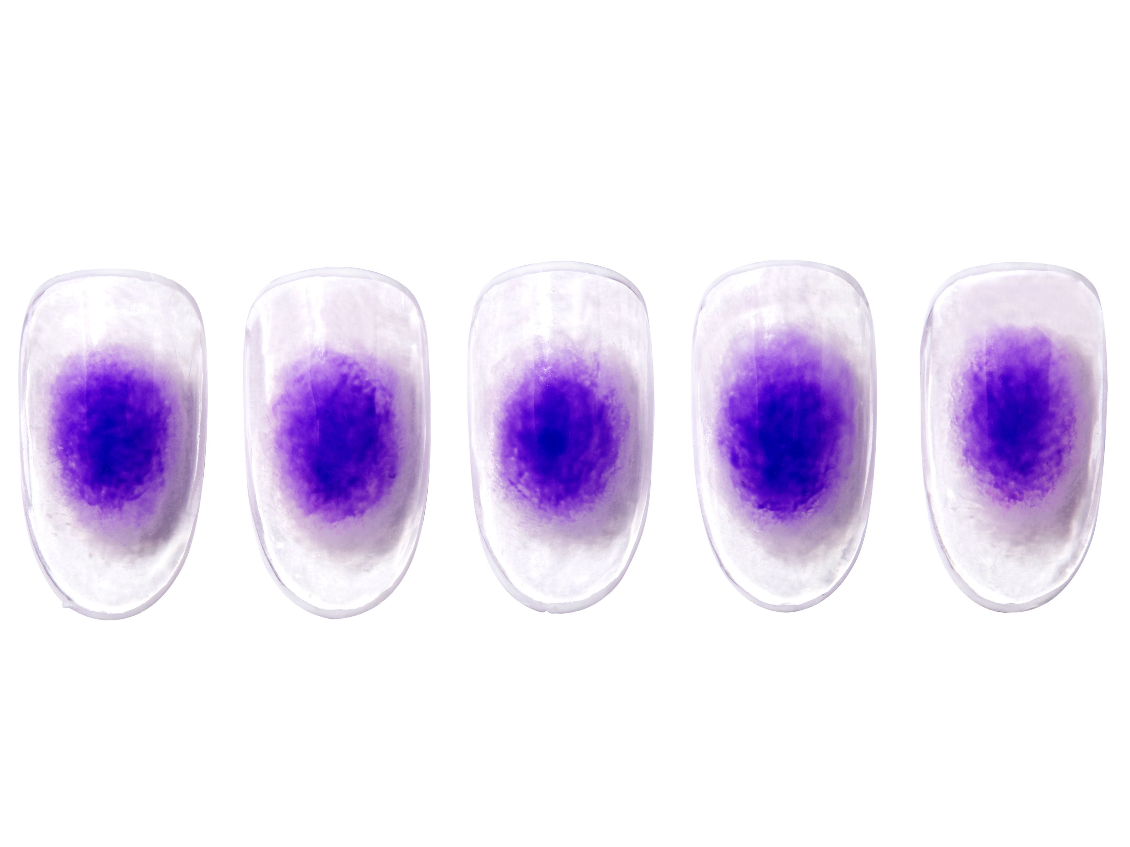 “My favorite new style in negative space is called a cheek nail [shown here],” says Rose. “It’s where color is concentrated at the center of the nail and faded outward like blush on a cheek. I also love using clustering tape, stones or glitter dead center on the nail and leaving the rest clear.”