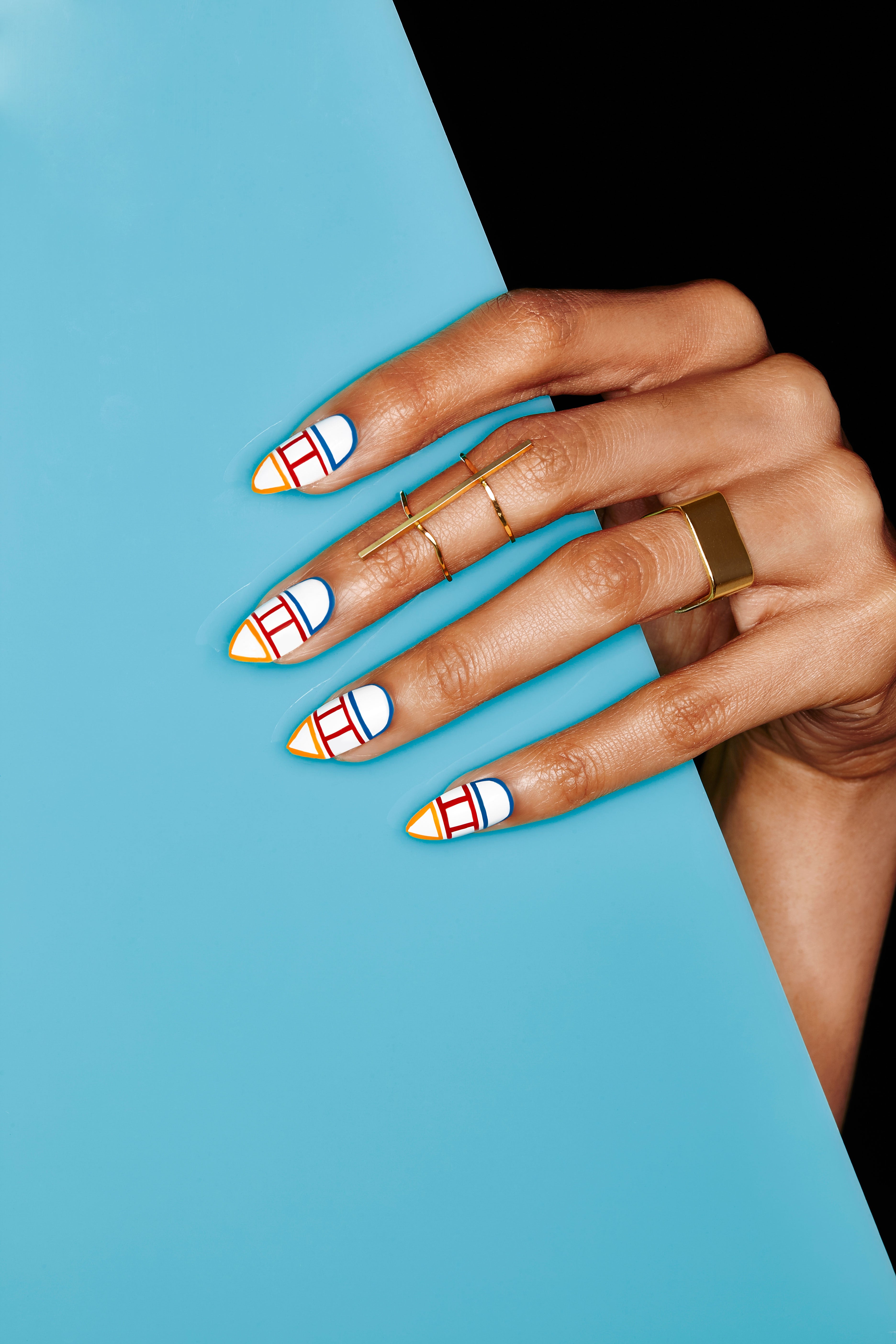 This geometric mani, created by Gracie J of The Editorial Nail (@theeditorialnail), plays up shapes, lines and color-blocking patterns, works on anyone and a particularly great option for the girl who likes a style that’s slightly more subtle than a full-out narrative nail.