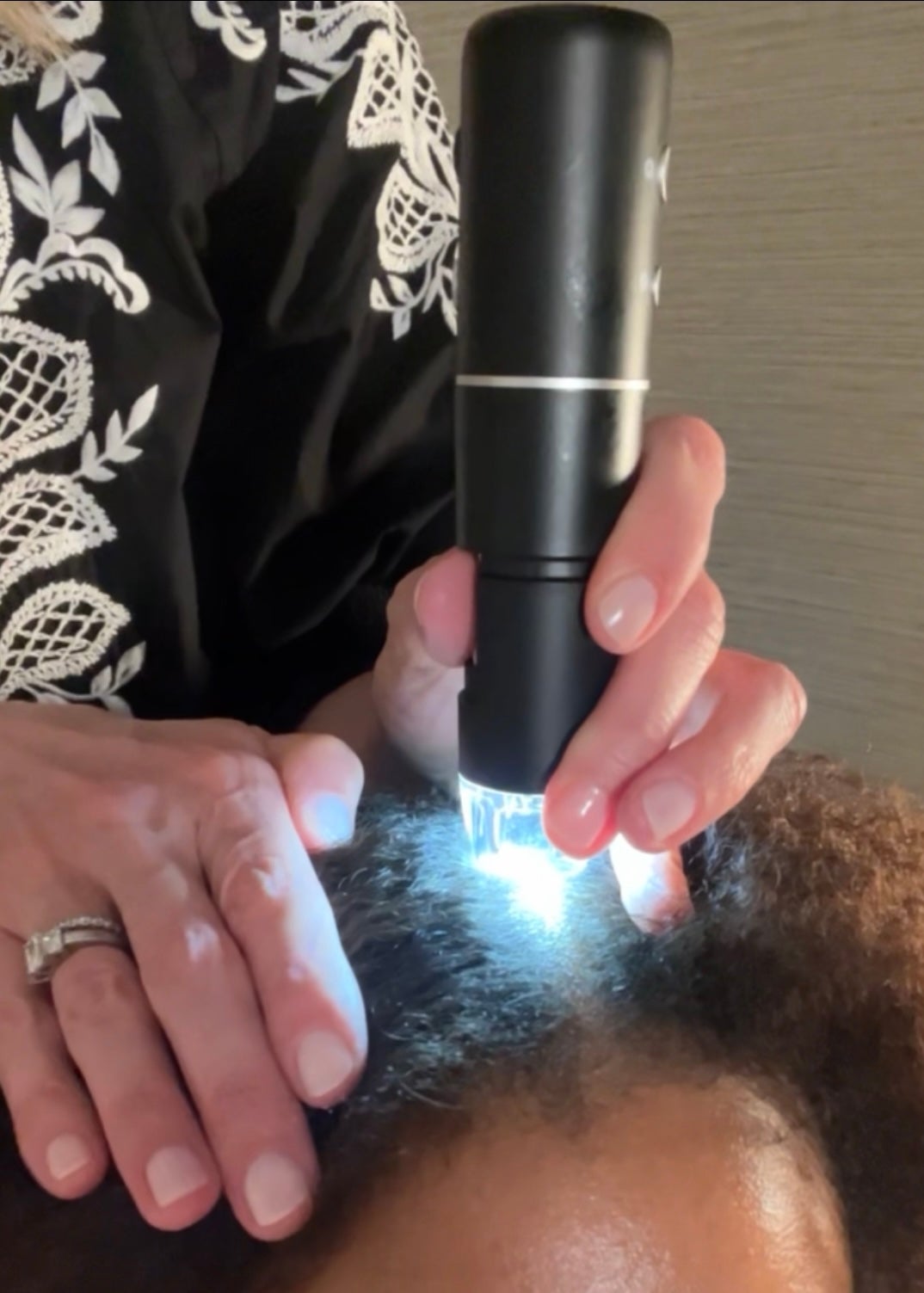 The best way to describe it is like a facial for your scalp. Depending on where you go, the treatment can be anywhere from one to two hours and feels like an extended shampoo bowl session. Nic began with a consultation, asking about the state of my scalp, if I was experiencing any issues and what my at-home care and styling routine entailed to best assess what my hair and scalp would need. She then used a microscope to examine my scalp on the follicular level. This was one of the coolest parts because I had never seen my scalp up close and she was able to point out areas where I had some dryness but also clogged pores which I wasn’t expecting.