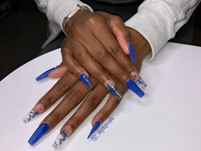 Whether you want to adorn your nails with gold embellishments and just a touch of blue, or use bling as a replacement for white, there’s no limit to what you can do if your nail tech has the skills. With so many schools and so many colors, it’s an opportunity for nail artists to really show off their creative chops.