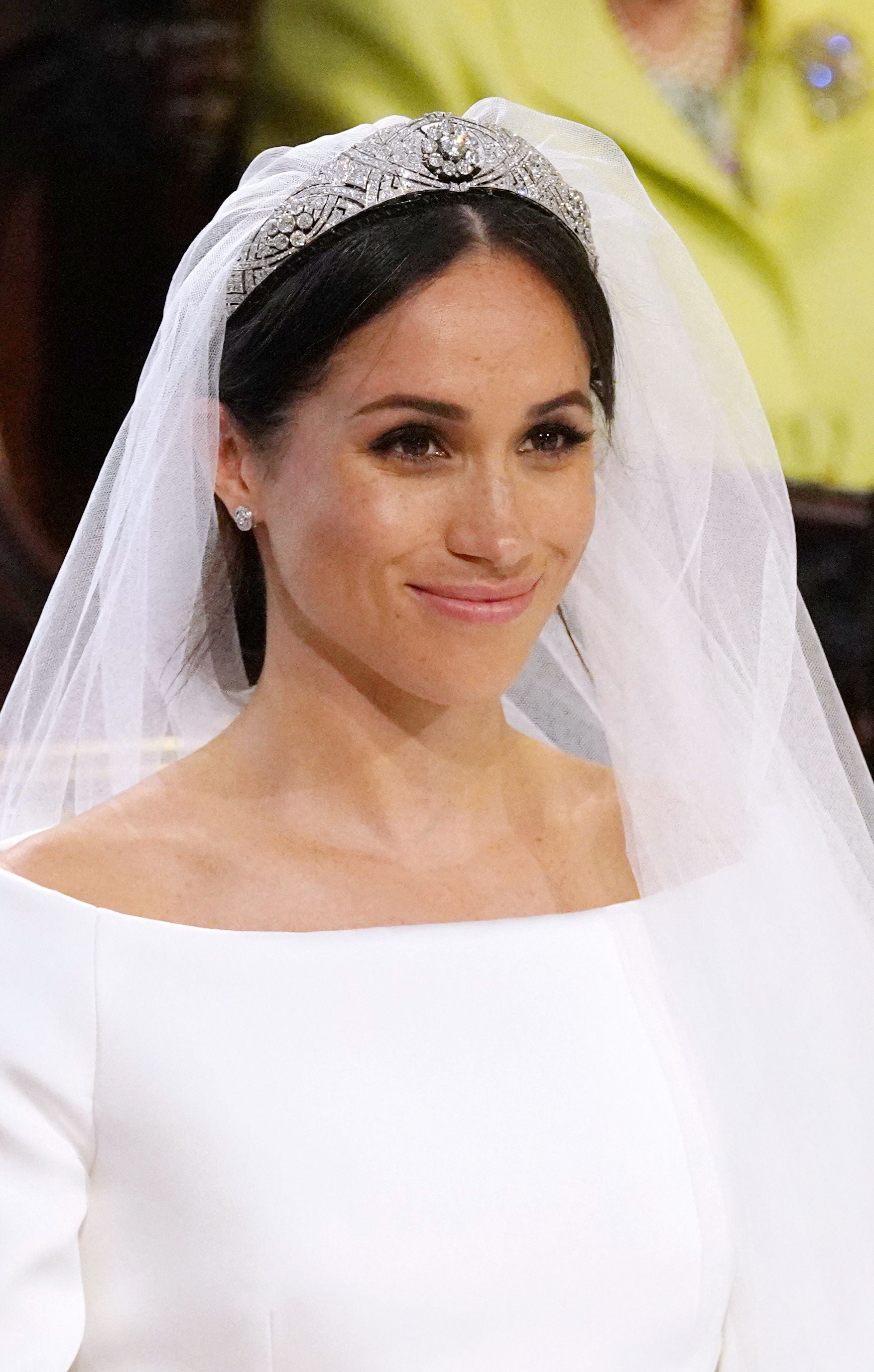 For hair, Meghan went for a classic low pulled back updo, with a center part, that perfectly showed-off her face. The look was pulled together by a stunning tiara—on loan from Queen Elizabeth—that peeked out beneath a beautiful full-length lace veil. Markle finished the look with a nude manicure.