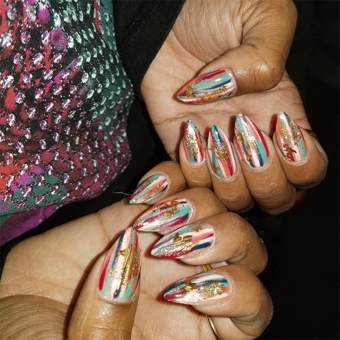 Make a statement this season with a fun pop of color and gold glitter to shine brightly in this set by celebrity nail artists
