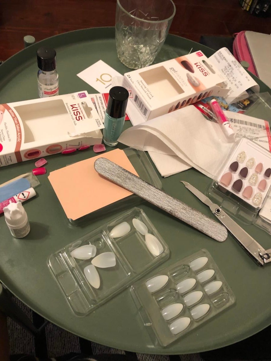 - Have a kit on hand when you’re about to apply the nails. It should include a nail file, emery board, nail glue, and polish products if you’re going to paint them yourself.