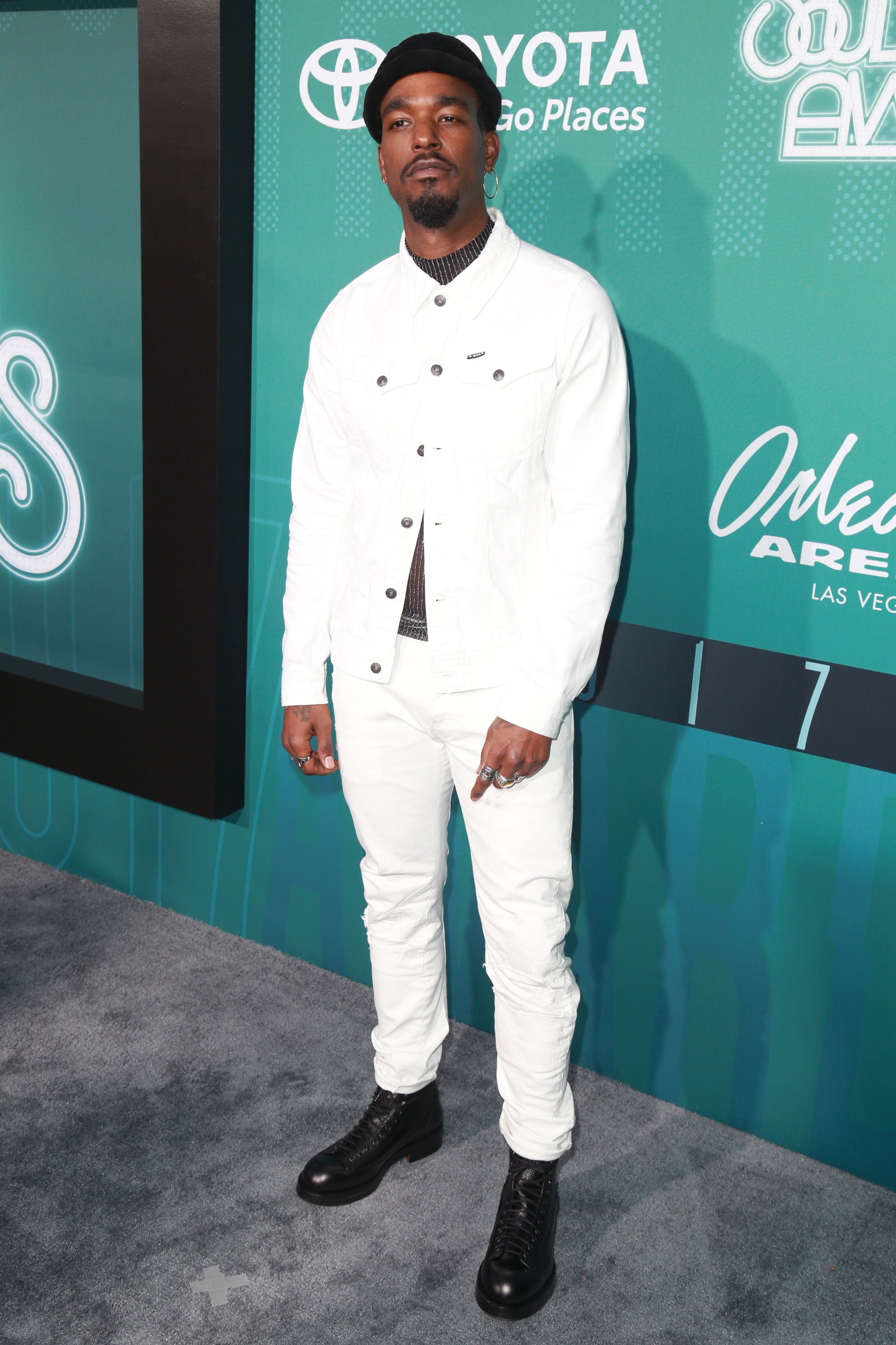 Luke James attends the 2017 Soul Train Awards in Las Vegas, Nevada in a white two-piece look.