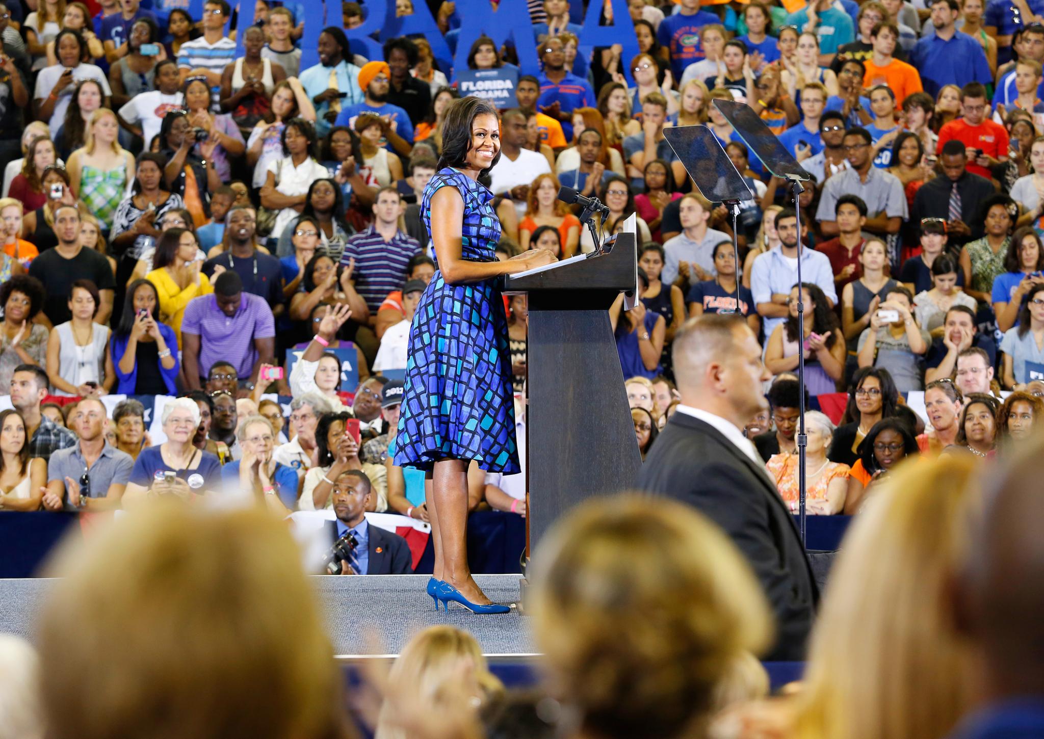 Again, the First Lady is keeping up with the Joneses in this brilliant blue dress at Broward College in Florida. One major plus: the style she’s sporting is an affordable Jones of New York dress from Macy’s, which means even a diva on a dime can get the look!