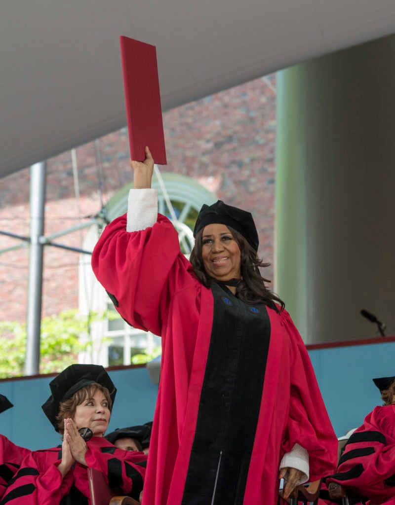 Although she was a high school drop out, Aretha Franklin received an honorary degree from Harvard University on May 29, 2014, and an honorary degree from Berklee College of Music on May 13, 2006 in Boston.