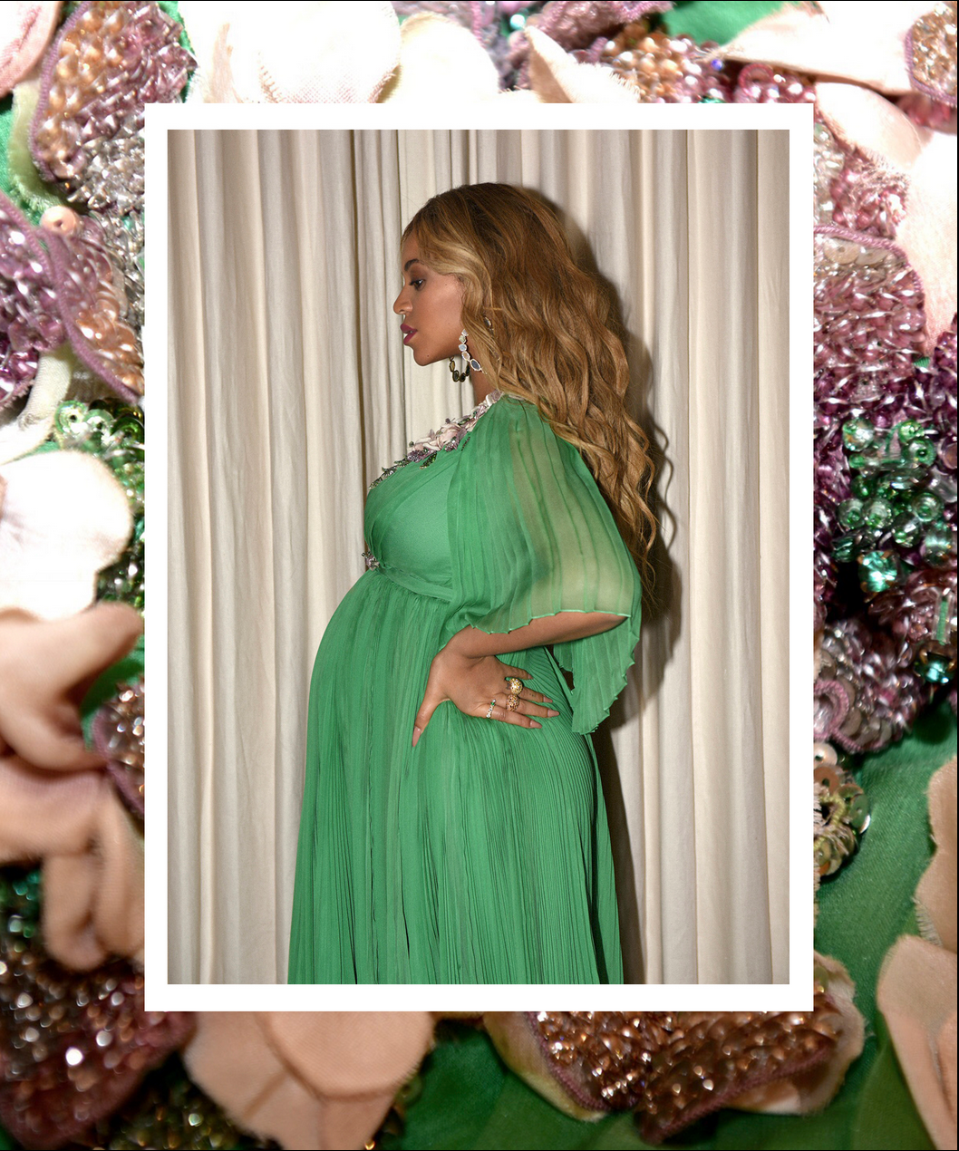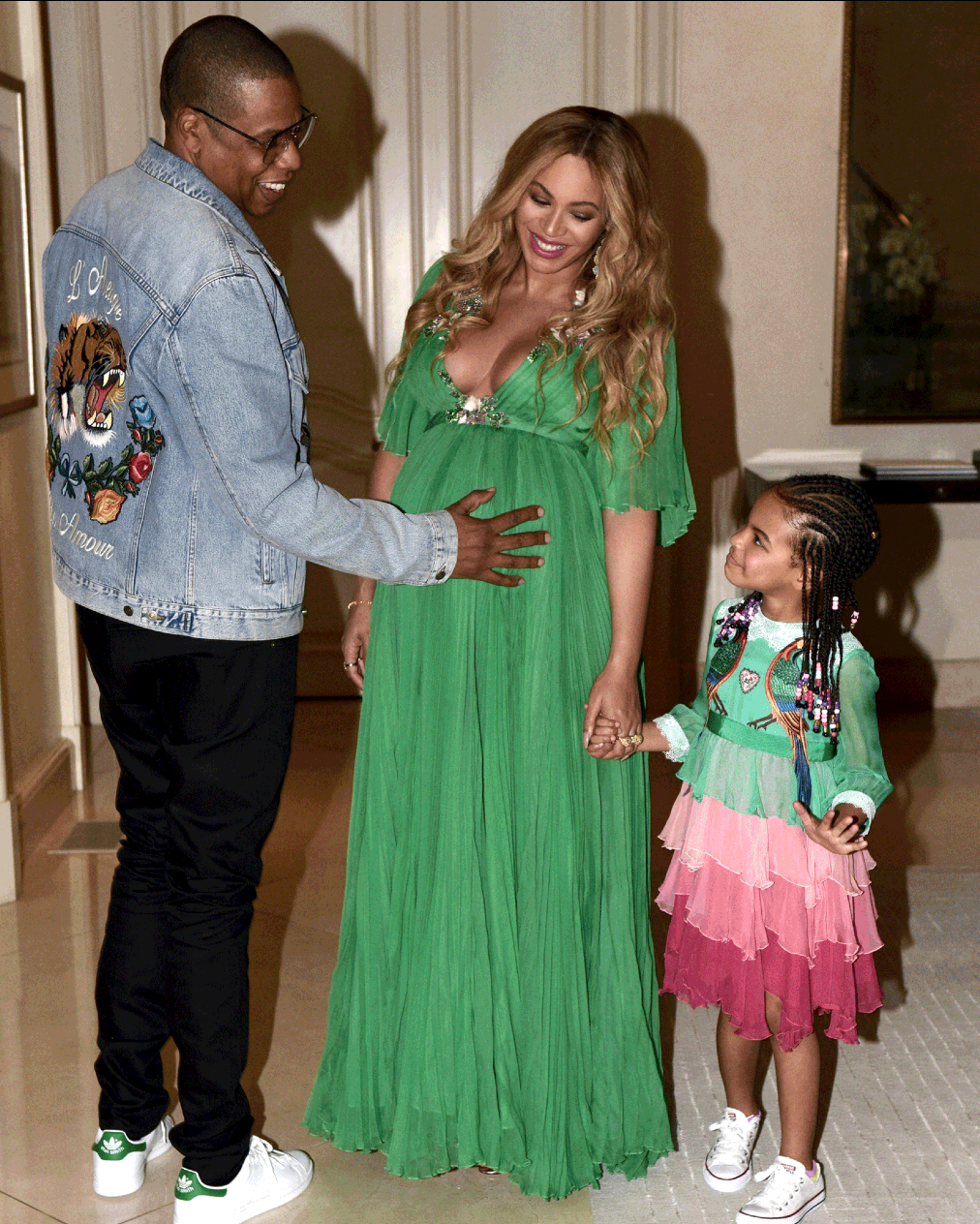 Beyonce rocked a $26,000 flowing green silk Gucci gown and gold Alaia shoes, Blue donned a $2,100 embellished tiered dress from the Gucci children’s line and Jay Z got on board with the cuteness wearing a $5,000 Gucci embellished denim jacket.