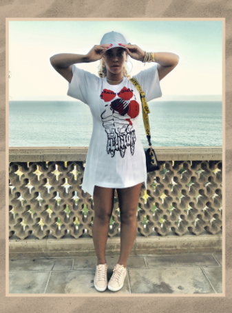 As for the rest of her look, Beyoncé wore Stella McCartney’s Lindsey Top, which she actually chose to wear as a dress, and carried a Binder Clip Bag from Virgil Abloh’s Off-White label. Bey finished off the look with a white Plane Icon Dad Hat, which was also a nod to Jay-Z. The hat is a staple for Jay-Z’s Roc Nation company.