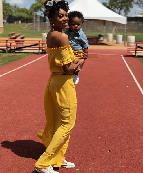 Sanya is all smiles with her feet on the track and her baby in her arms.