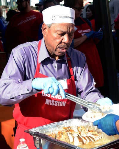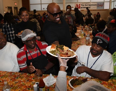 YG’s mother Shonee Jackson, Master P, Mayor Aja Brown, American sprinter Carmelita Jeter and Senator Isadore Hall, III attend the 3rd Annual Compton Community Thanksgiving Dinner at Douglas F. Dollarhide Community Center
