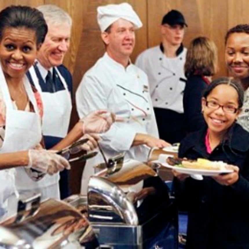 First Lady Michelle Obama made a surprise visit to Ramstein's Air Base in Germany today, where she joined 200 soldiers for a special Veteran's Day meal -- even lending a hand in the cafeteria line to help serve the young men and women and their families. Mrs. Obama also walked through the room, talking to soldiers and thanking them for their dedication to their country. "We are so grateful to all of you," she told them. "Not just our servicemen and women, but their kids, wives, husbands and parents." Here, the First Lady praises 10-year-old Malaysia Chevere for being a "straight A student."