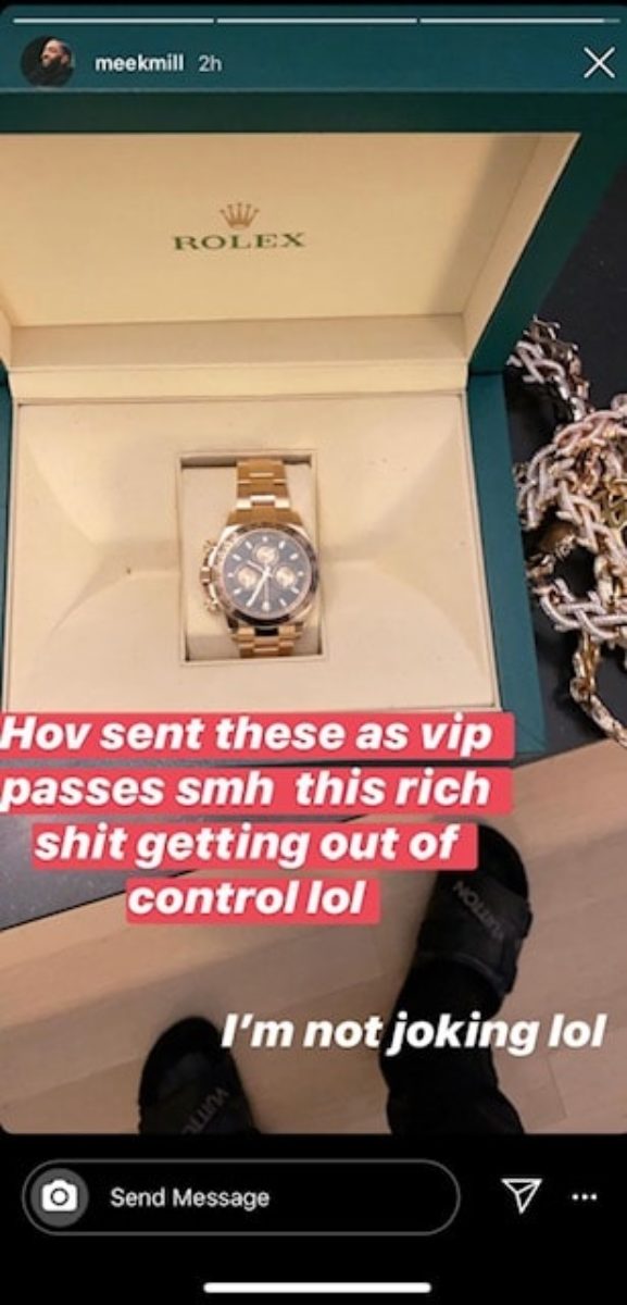 “Hov sent these as VIP passes,” Meek wrote on his story. “SMH this rich s–t getting out of control lol…I’m not joking lol.”