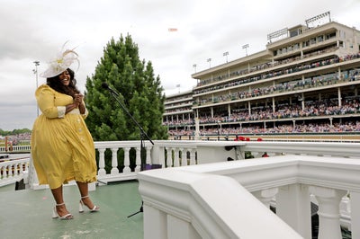 LOUISVILLE, KENTUCKY – MAY 07: Brittney Spencer reacts during the 148th Kentucky Derby at Churchill Downs on May 07, 2022 in Louisville, Kentucky. (Photo by Michael Loccisano/Getty Images for Churchill Downs)
