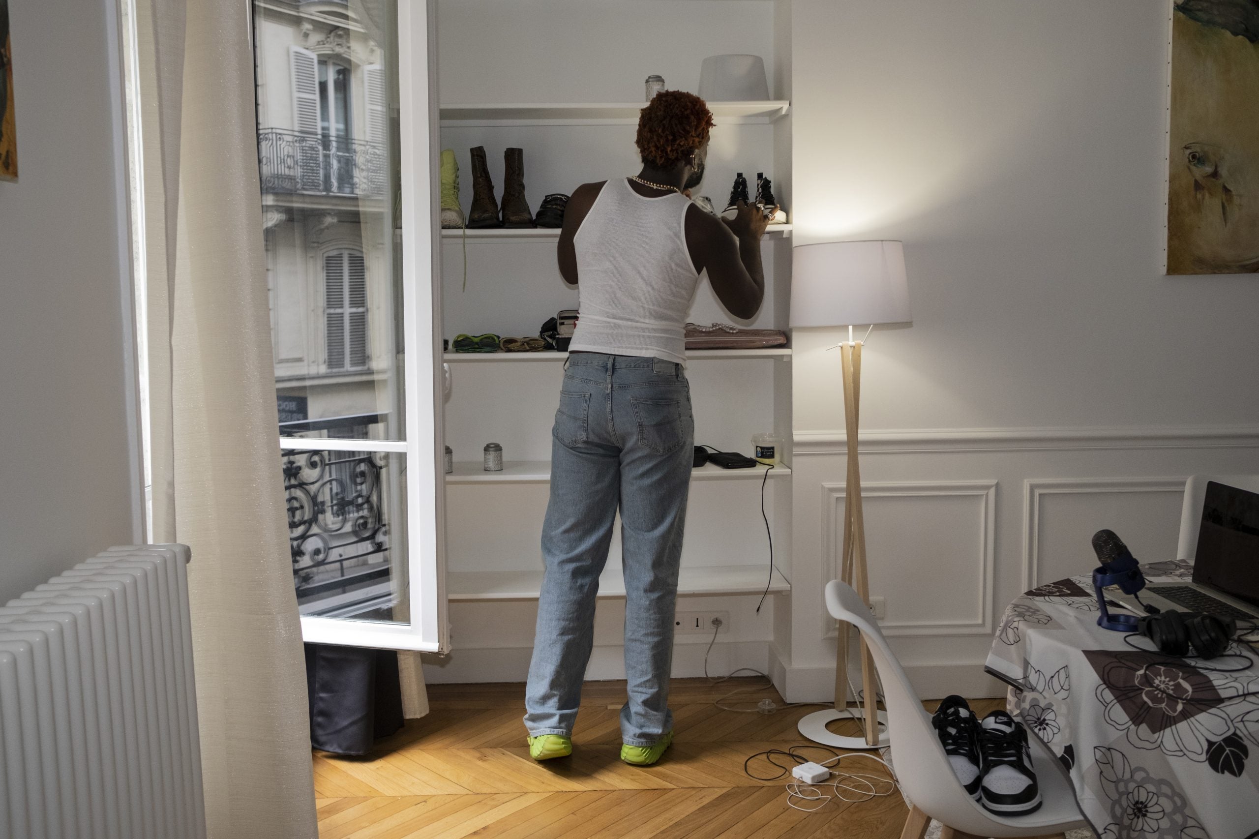Stylist Alexander-Julian Gibson setting up footwear options.