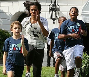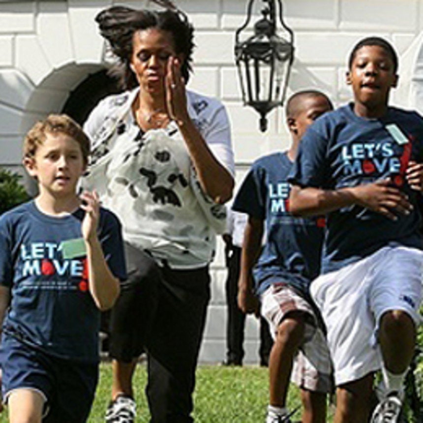 When the First Lady asks you to exercise with her on the White House South Lawn, you say yes. Actually, I declined at first, but her aides persuaded me! I was out there for the first of Michelle Obama’s “South Lawn Series,” an offshoot of her “Let’s Move!” campaign to end childhood obesity. Partnering with the White House Visitors Office and the Office of Public Engagement, this summer the White House will host children to participate in sports, games and other activities to encourage 60 minutes of daily active play (the expert-recommended amount, Mrs. Obama explained). About 80 amped-up kids from D.C. public schools came out this afternoon, along with five gym teachers and five professional sports trainers from the Washington Redskins, Capitals, Nationals, Wizards and Mystics. “What I want you guys to do is make a commitment that you will do your best to get that 60 minutes in every single day,” Mrs. Obama, sporting sequined black Converse sneakers, told the students before they commenced a series of high-energy relay races, exercise drills and obstacle courses. “Will you promise me that?” She was about to start a circuit with a group of them when she came over to the press area, looking at a few of us with a playful smile. “You guys should do it!” Next thing you know, I’m on the South Lawn in my work clothes, doing high-knee jumps, “butt kicks” and backward jogs. I was a little awkward with it, but Mrs. Obama gave me a high-ten for being a good sport. For more Cynthia Gordy Obama Watch stories, click here.