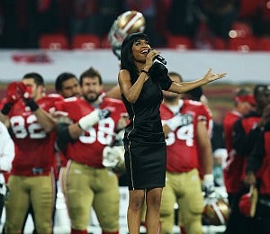 Michelle Williams sang the US National Anthem at the NFL International Series match between the Denver Broncos and San Francisco 49ers at London's Wembley Stadium on October 31, 2010. Those red peep-toe shoes are a nice touch. Girl, where'd you get those?